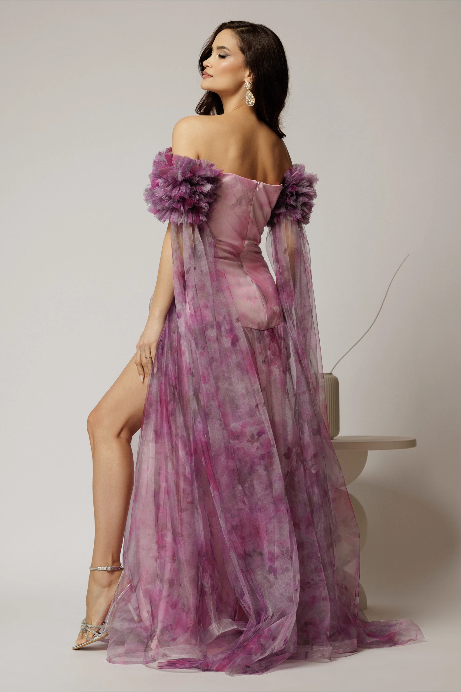 Este o superba rochie de seara din tull imprimat in nuante de mov, cu maneci ample. Rochia are un croi tip sirena, cu crapatura pe picior si bustul decoltat.