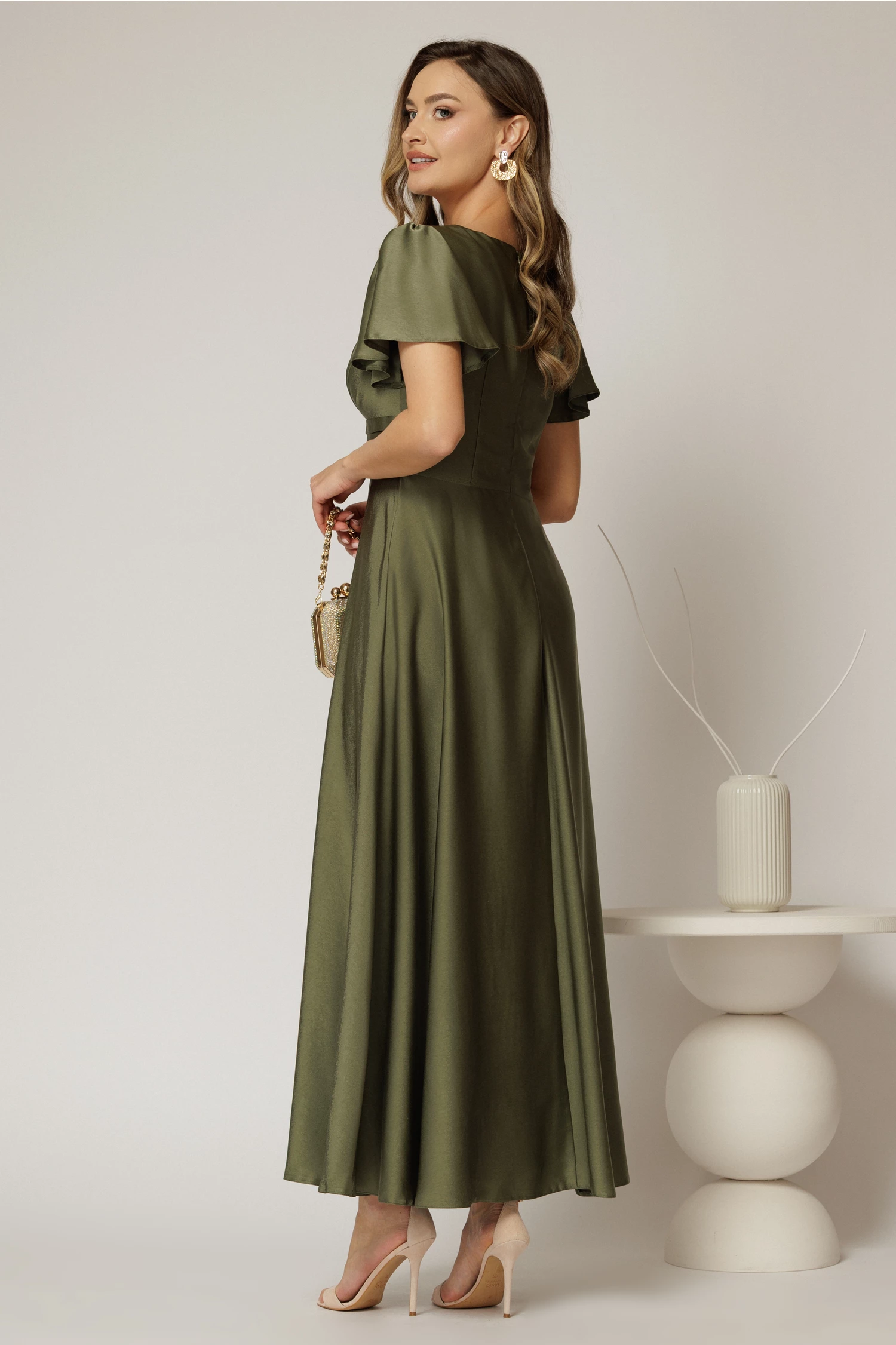 Rochie lunga kaki de ocazie cu decolteu adanc si maneci scurte evazate