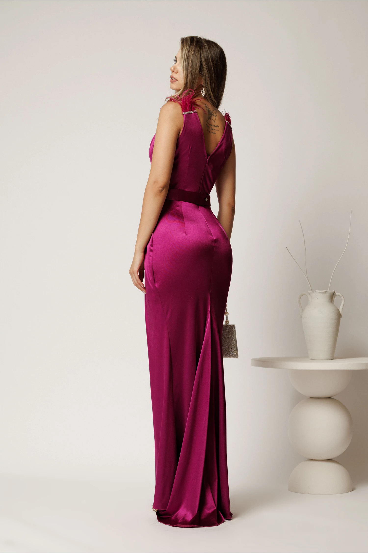 Rochie lunga magenta din tafta cu strasuri si pene la umeri