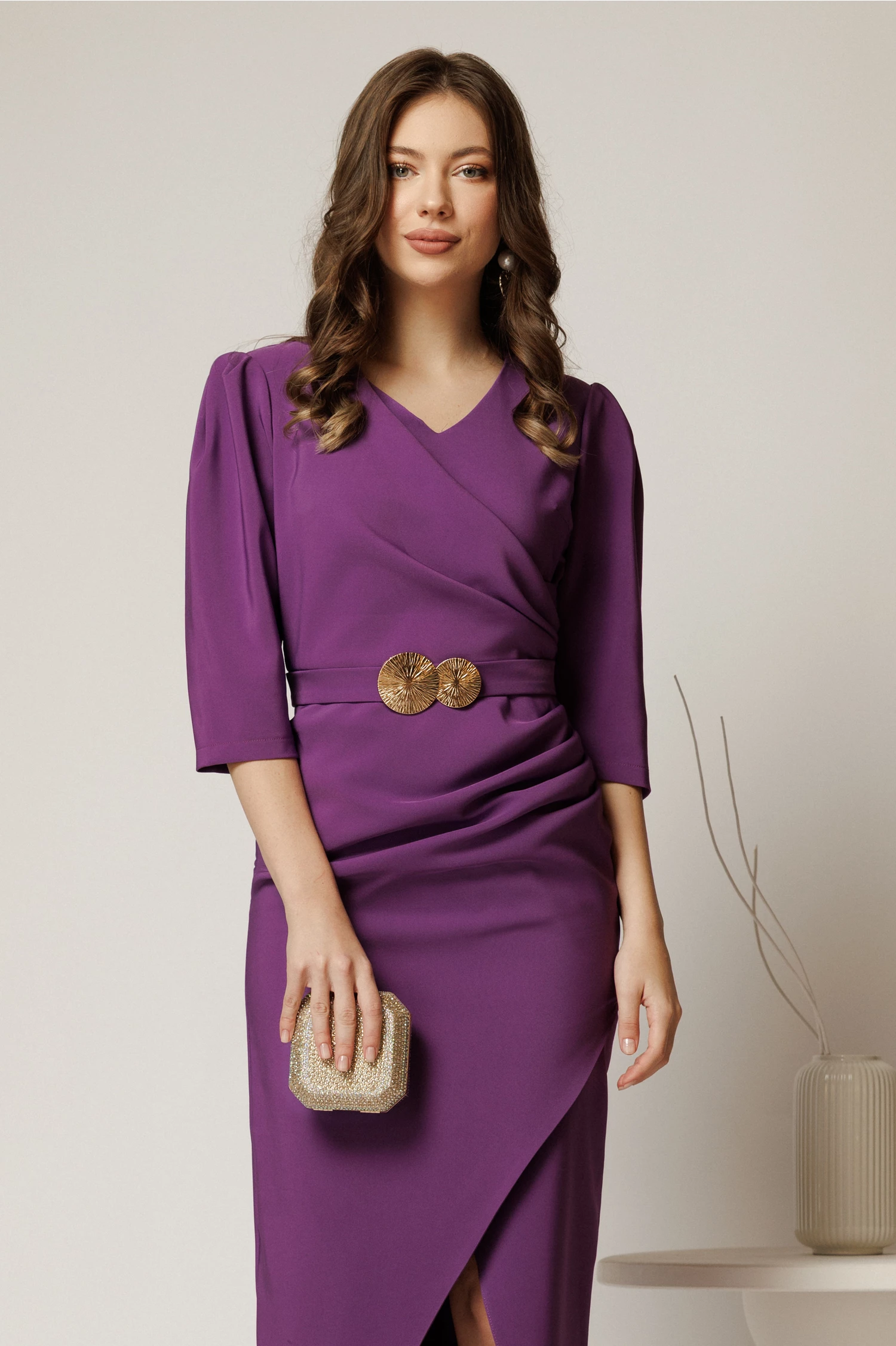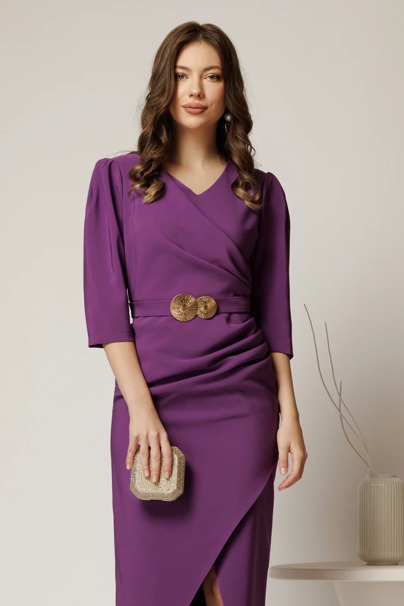 Fii atractia serii la un eveniment in aceasta superba rochie mov, al carei croi cu fronseuri evidentiaza orice silueta. Decolteul este in V cu aspect de petrecut, iar talia este accesorizata cu un cordon cu catarama.