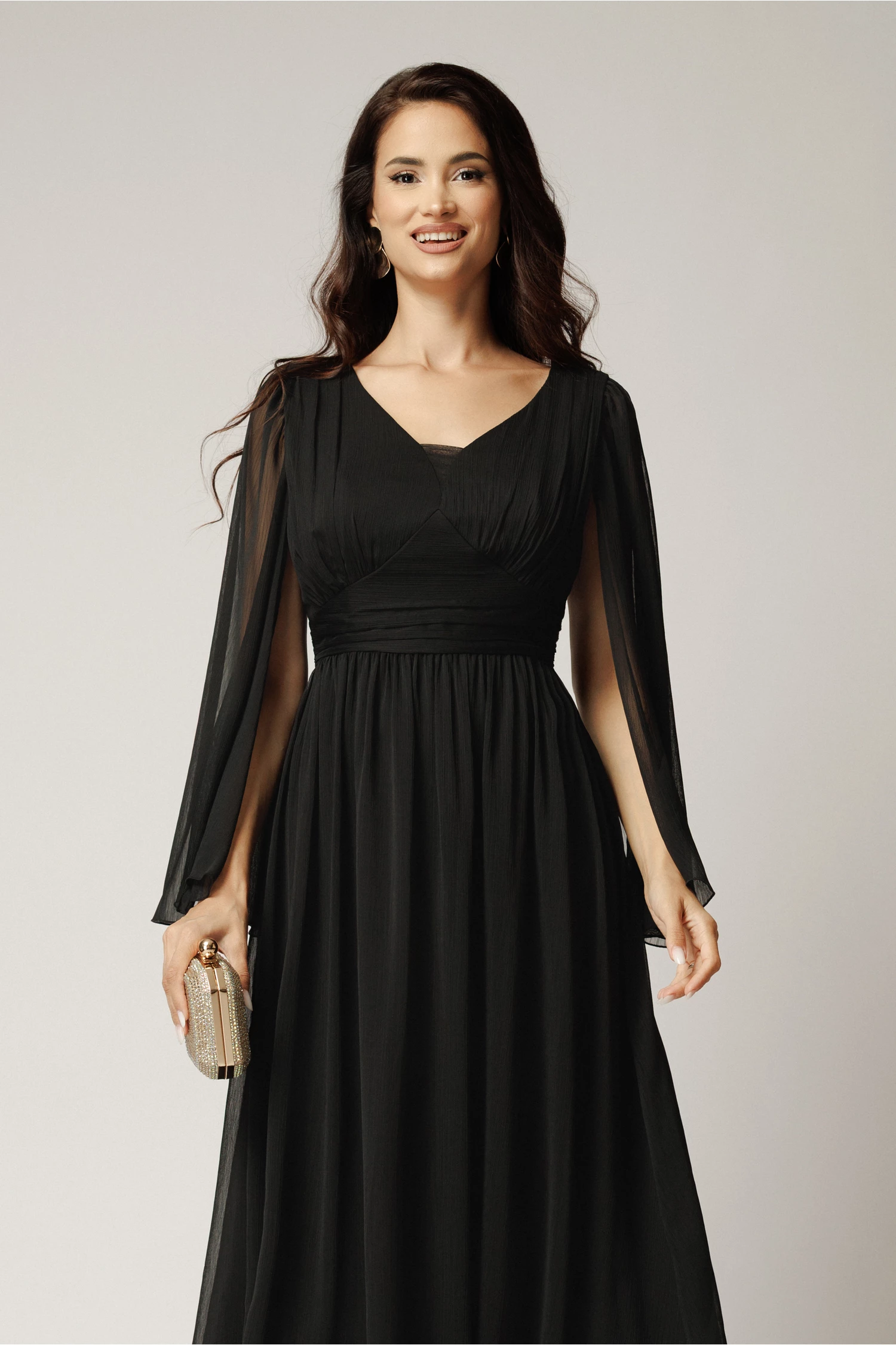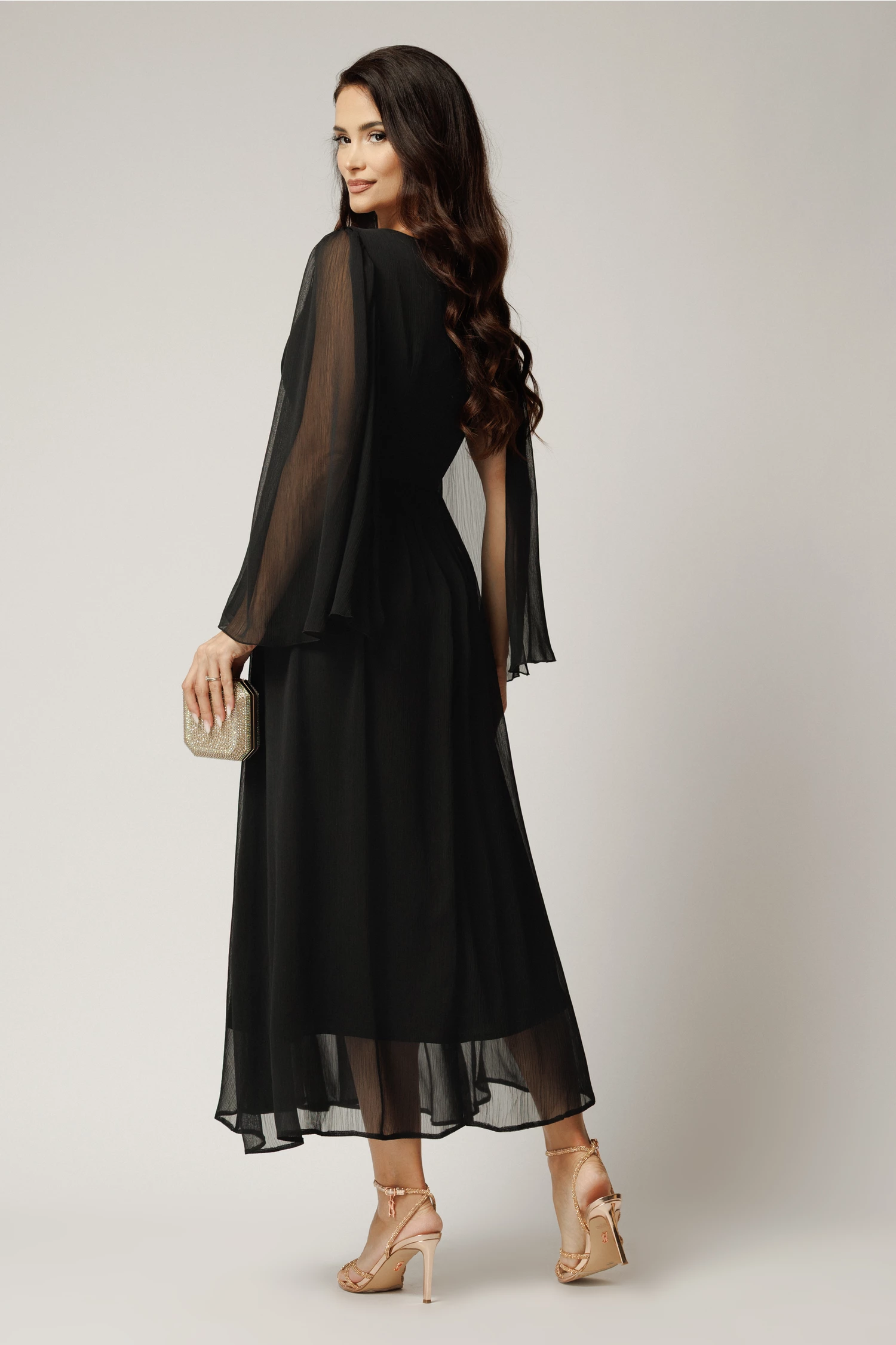 Rochie lunga neagra din voal creponat in clos cu maneci despicate