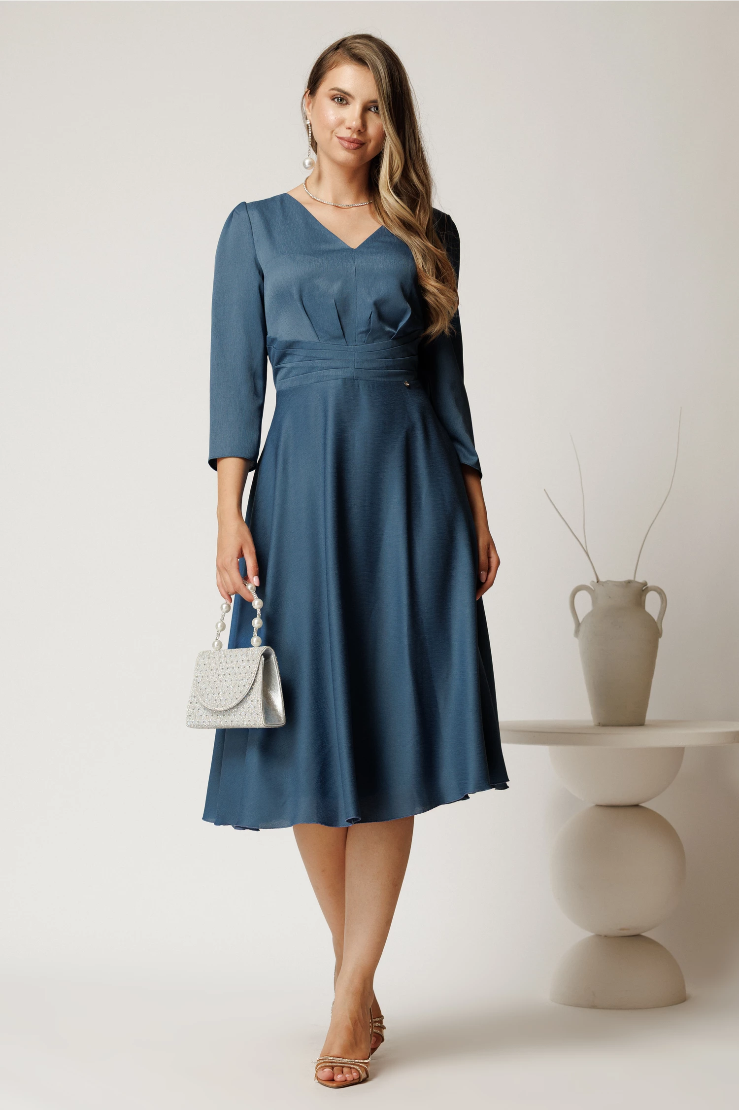 Rochie midi elaganta din voal cu pliuri pe talie. Are decolteu in V, maneci trei sferturi si croi clos.