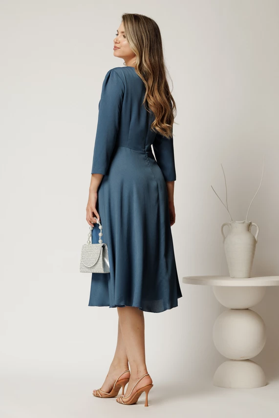 Rochie midi albastru petrol din voal in clos cu talie marcata