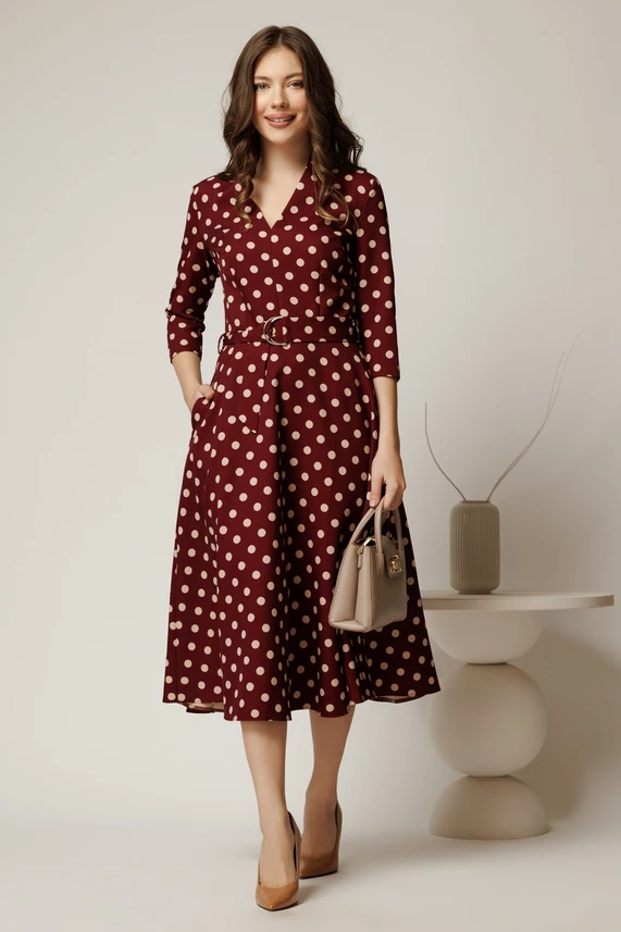 Rochie midi bordo cu buline din stofa cu cordon in talie