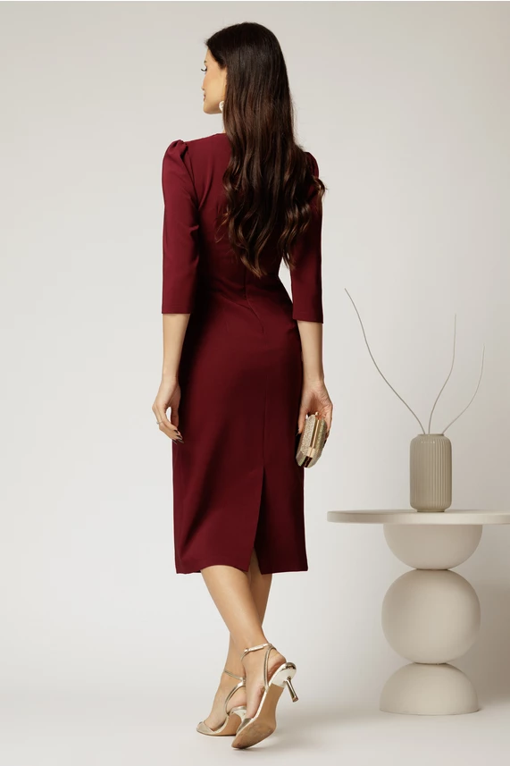 Rochie midi bordo eleganta cu accesoriu pe talie si pliuri
