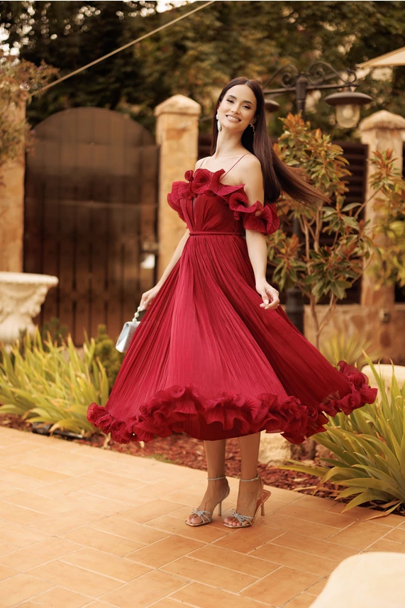 Rochie midi bordo in clos din voal satinat cu volanase la bust si la baza