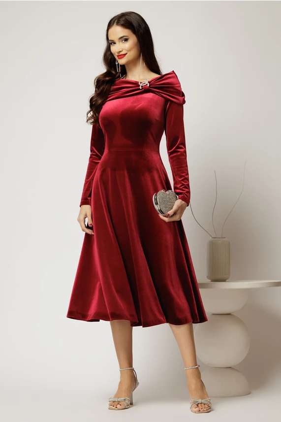 Rochie midi din catifea bordo cu umeri lasati si brosa