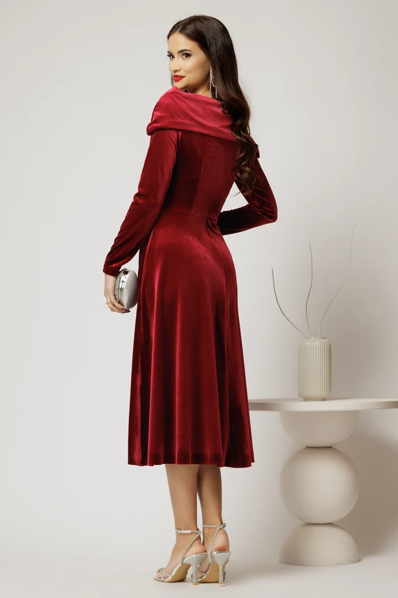 Este o rochie midi eleganta din catifea bordo, cu croi clos, maneci lungi si umeri lasati. Bustul este accesorizat cu o eleganta brosa.