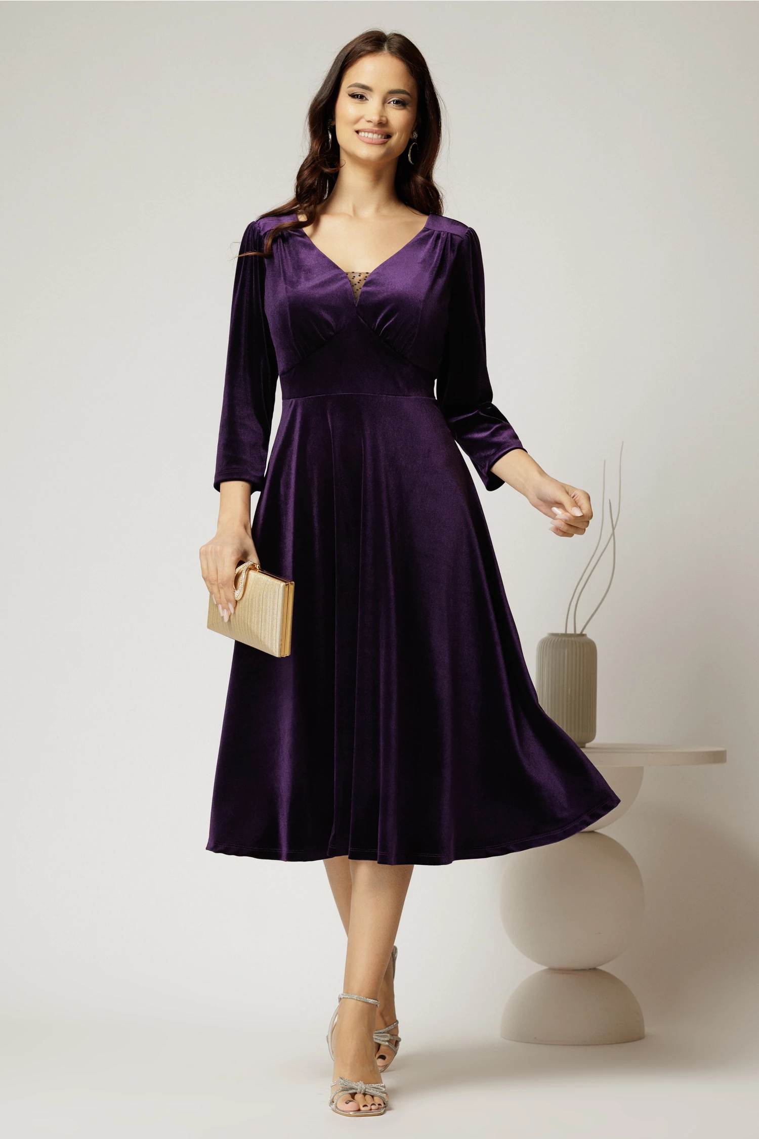 Este o rochie midi eleganta din catifea mov cu maneci trei sferturi si decolteu adanc in V cu tull transparent.