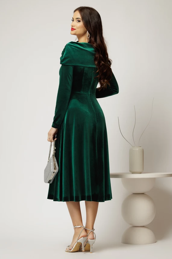 Este o rochie midi eleganta din catifea verde, cu croi clos, maneci lungi si umeri lasati. Bustul este accesorizat cu o eleganta brosa.