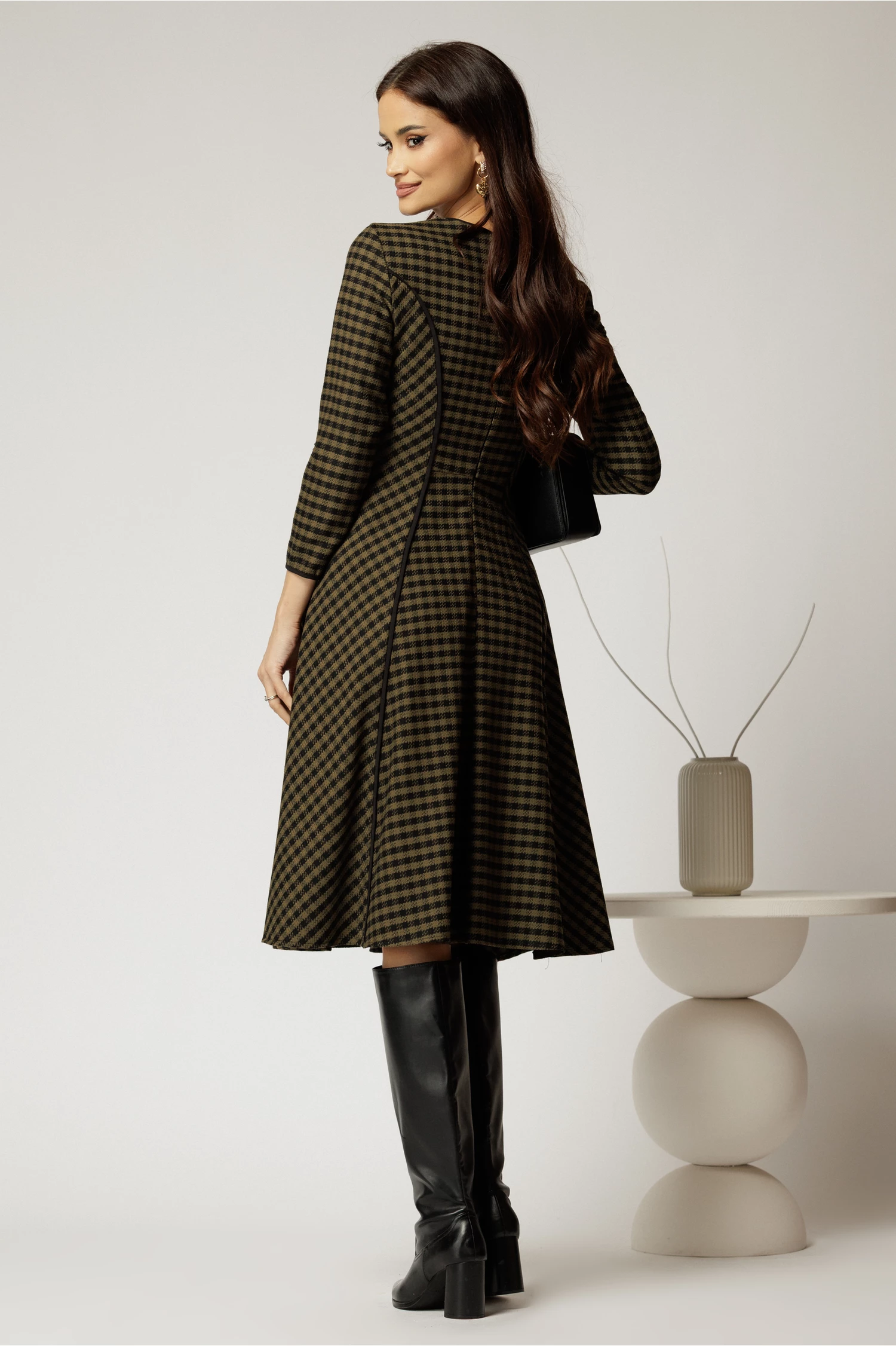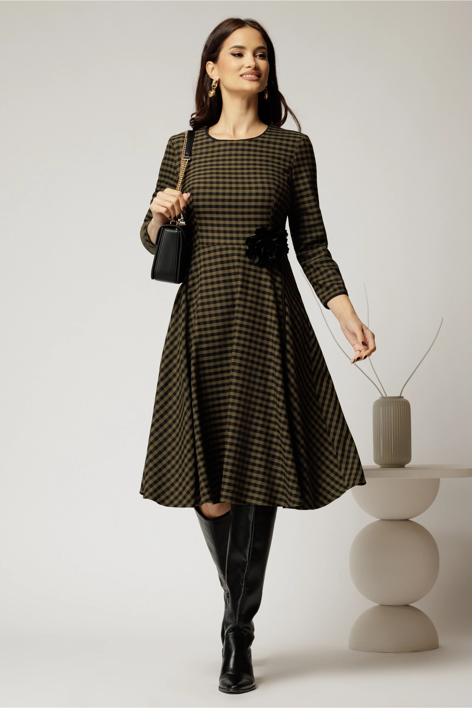 Este o rochie office de zi din stofa carou in nuante de verde si negru, cu decolteu rotund si accesoriu in talie.