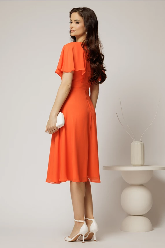 Rochie midi din voal oranj cu maneci evazate si decolteu adanc