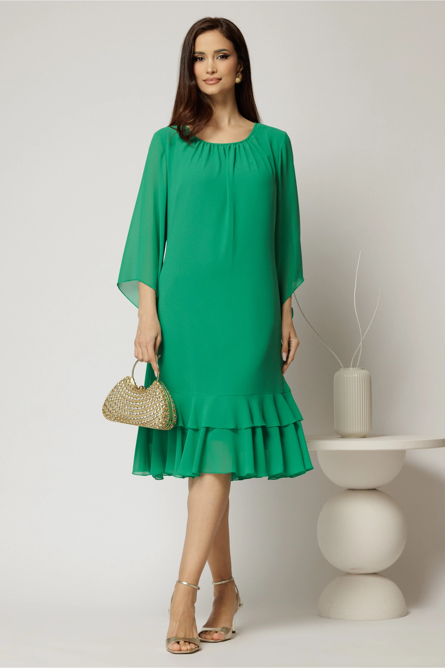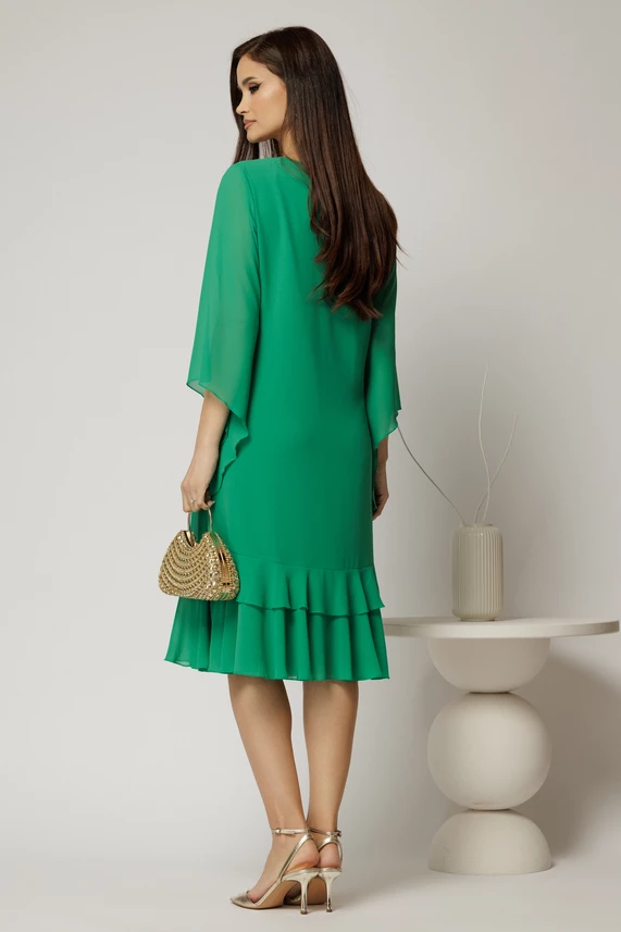 Este o rochie verde de ocazie, din voal, cu decolteul rotund, croiul lejer si volanase la baza.