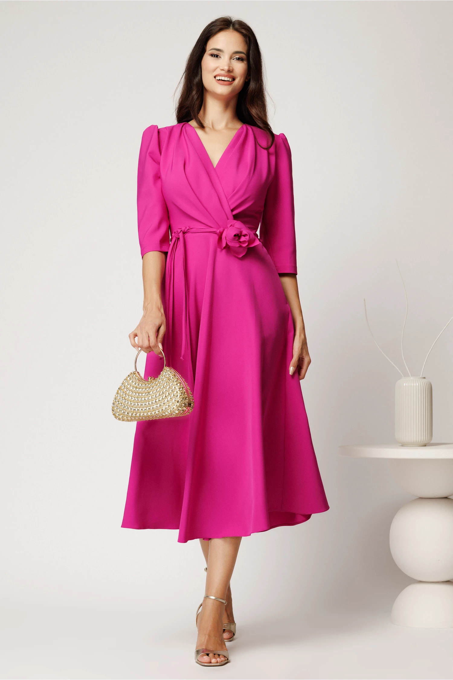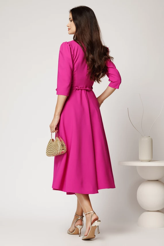 Rochie midi fucsia din stofa in clos cu floare in talie