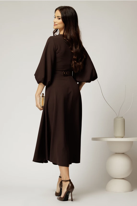 Rochie midi maro din crep in clos cu maneci bufante si curea in talie