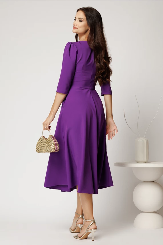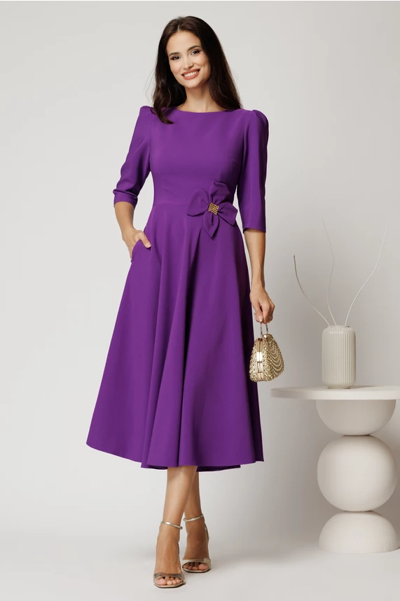 Rochie midi mov din stofa in clos cu floare in talie