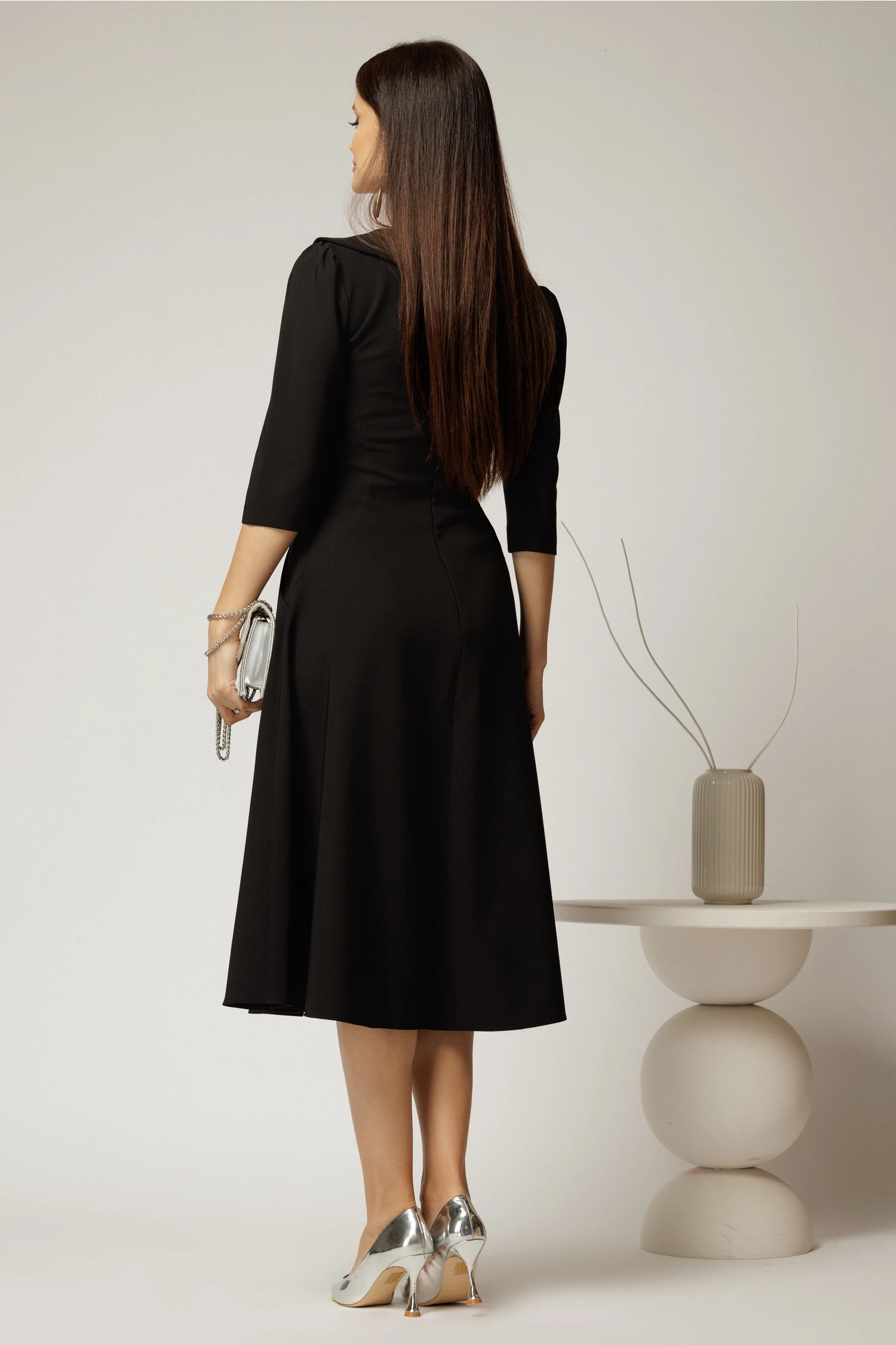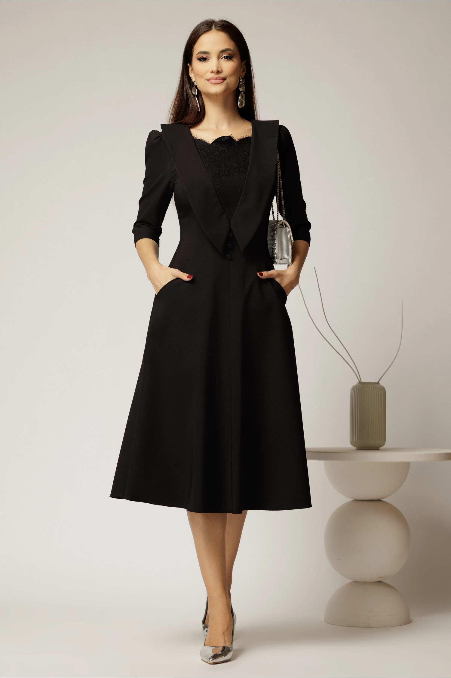 Este o rochie midi neagra de ocazie, cu insertii de dantela la bust si nasturi decorativi. Rochia are buzunare, croi in clini si nasturi decorativi.