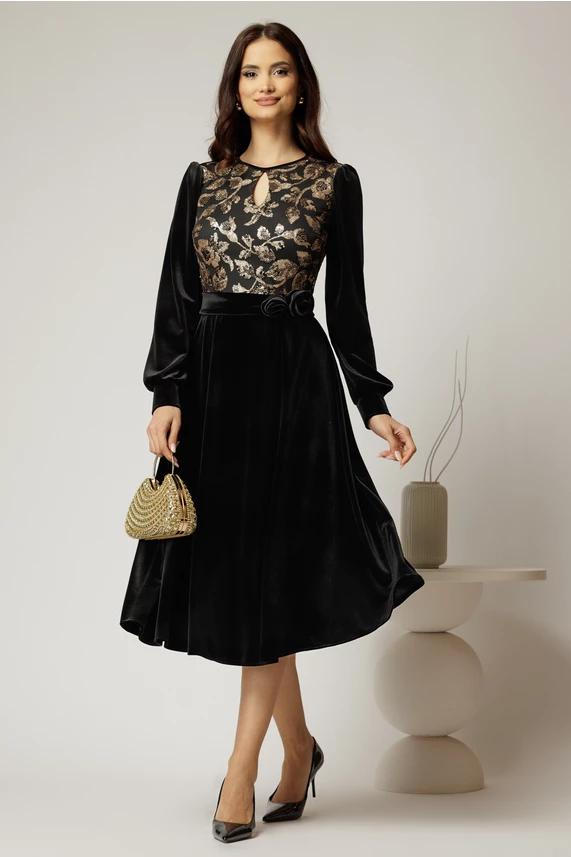 Rochie midi neagra din catifea cu bustul din paiete si cordon detasabil
