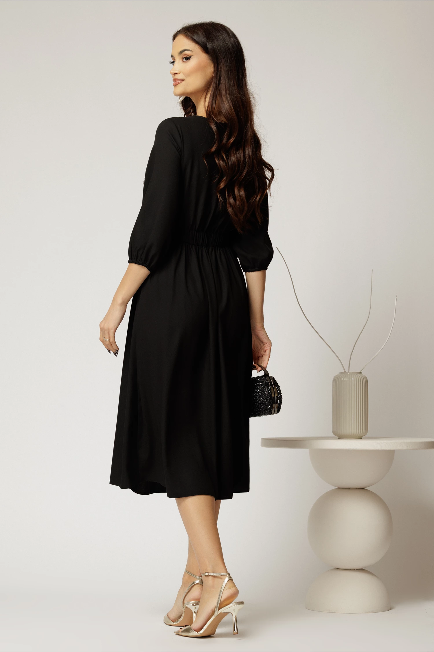 Rochie midi neagra din triplu voal in clos cu bust bej din dantela