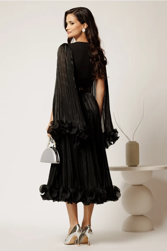 Rochie midi eleganta din voal satinat cu aspect creponat accesorizata cu o curelusa din strasuri in talie. Are decolteu in V, maneci lungi ample cu volane la baza si croi clos.