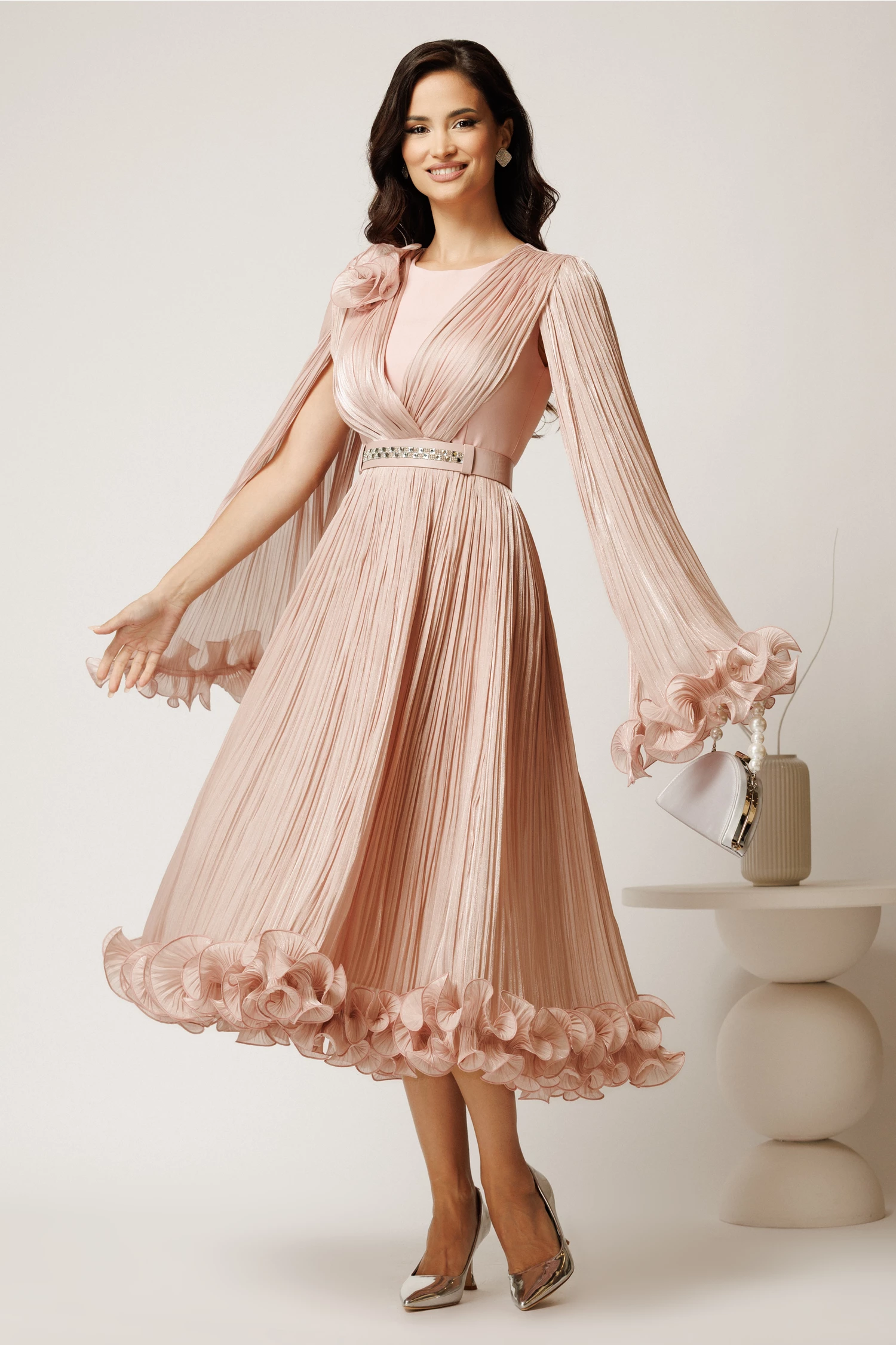 Rochie midi eleganta din voal satinat cu aspect creponat accesorizata cu o curelusa din strasuri in talie. Are decolteu in V, maneci lungi ample cu volane la baza si croi clos.