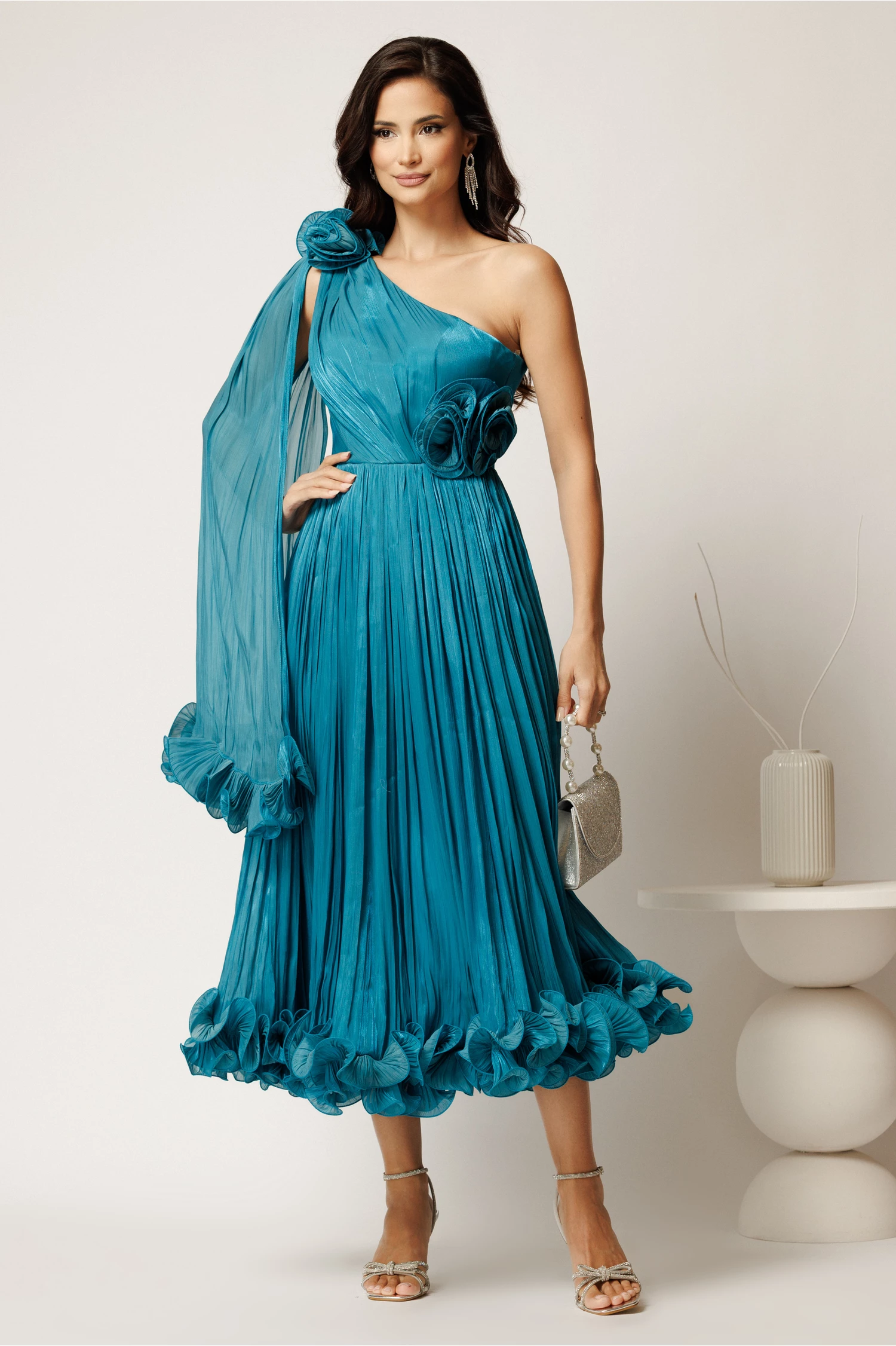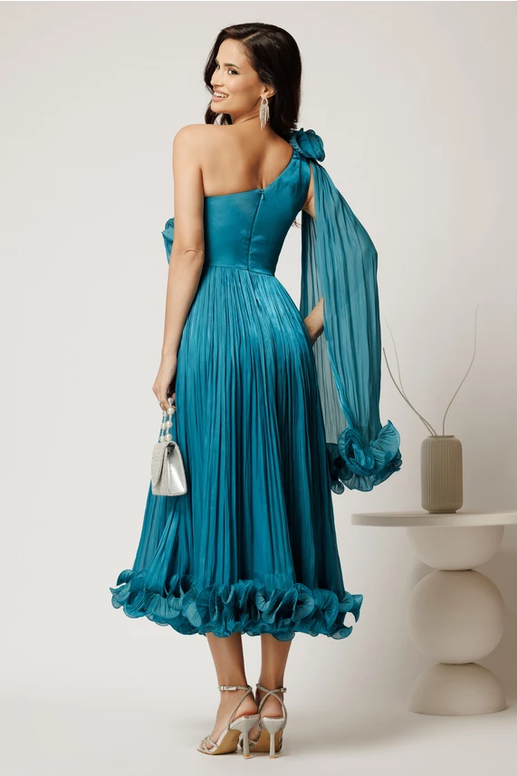 Rochie midi turcoaz din voal satinat cu volanase la baza si flori in talie si pe umar