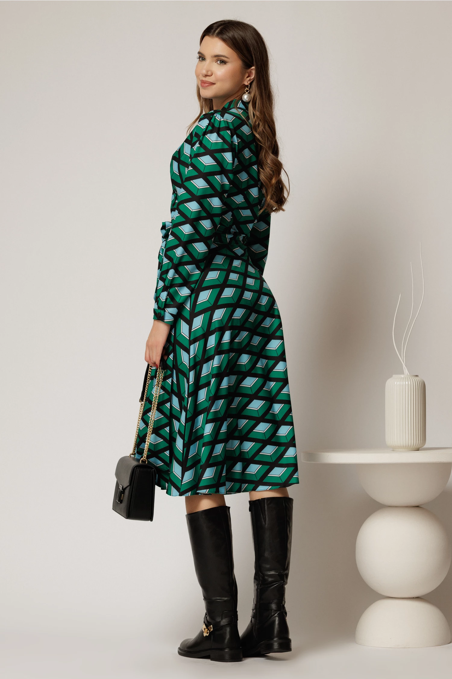 Rochie midi verde din stofa petrecuta cu imprimeuri negru si cordon in talie