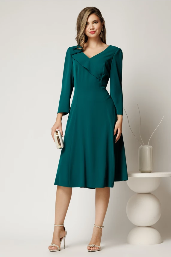 Este o rochie midi verde din triplu voal, pe care o poti purta la evenimentele speciale din viata ta. Rochoa este accesorizata cu cu floare decorata cu perle elegante.