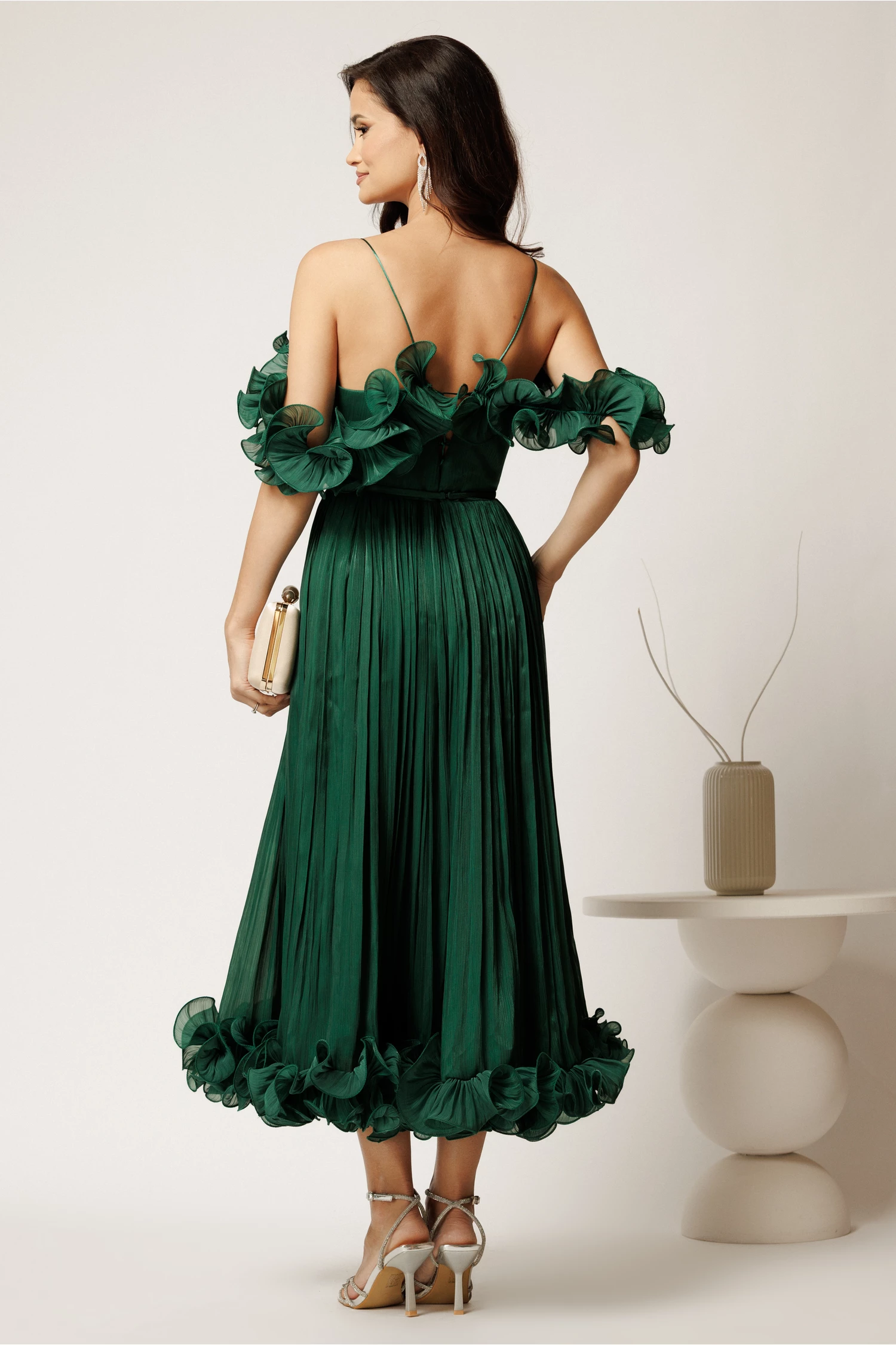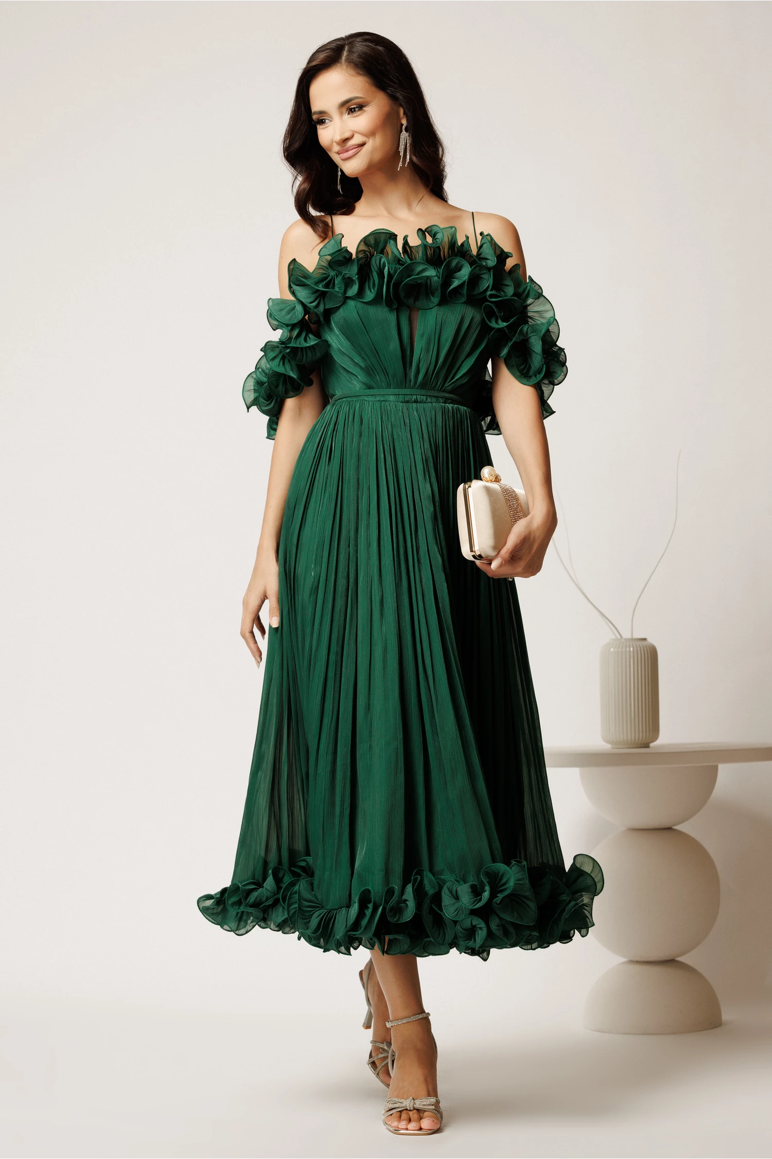 Rochie midi verde in clos din voal satinat cu volanase la bust si la baza