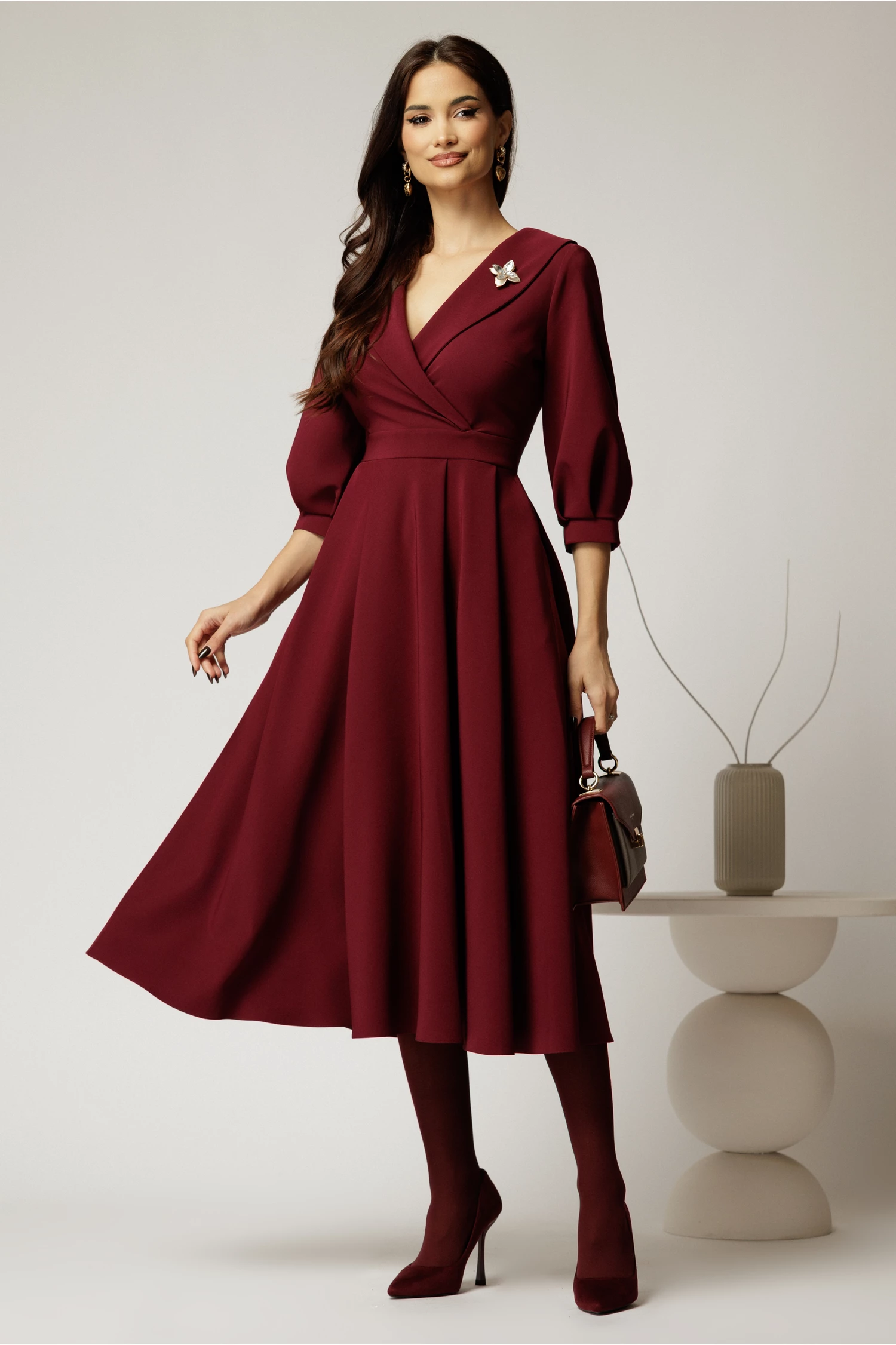 Rochie office din stofa cu rever si pliuri pe fusta. Are decolteu in V, maneci trei sferturi, croi clos si buzunare functionale.