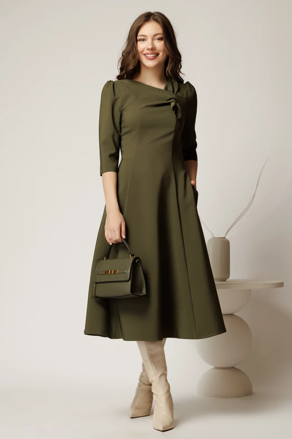 Rochie office din stofa cu funda pe bust. Are decolteu rotund, maneci trei sferturi, croi clos si buzunare functionale.