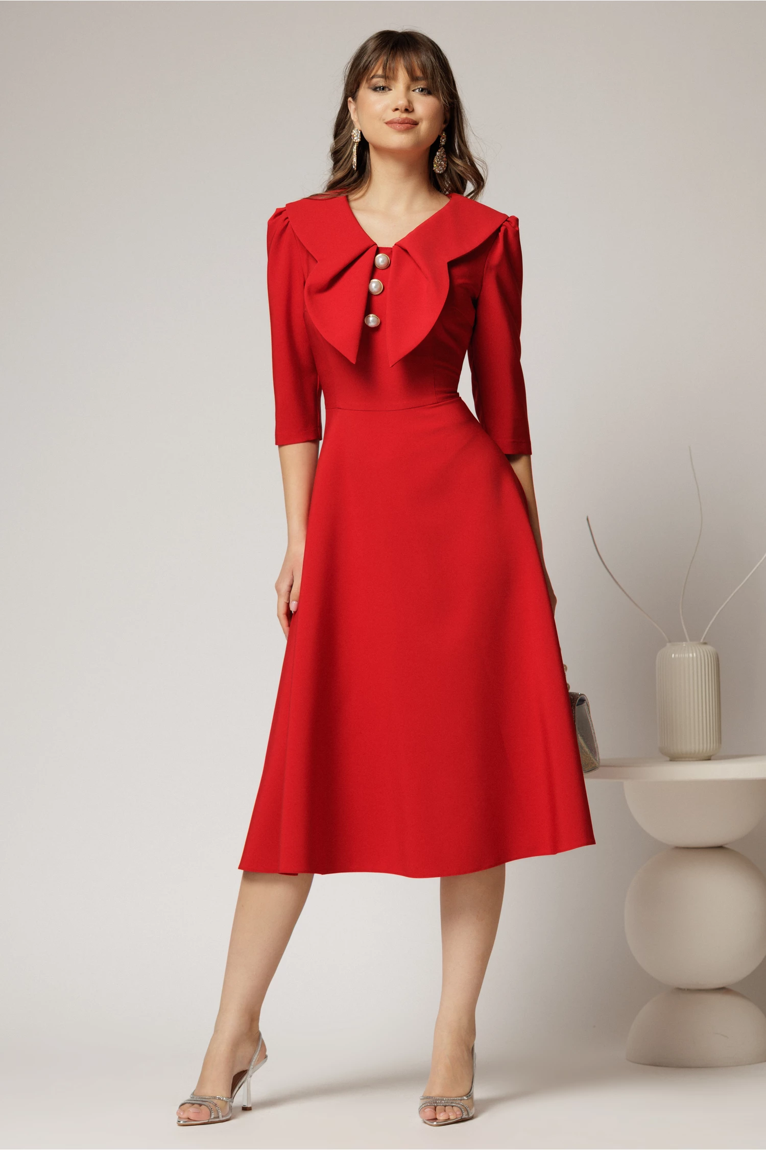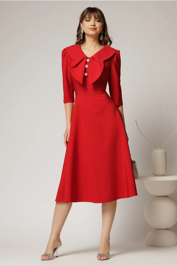 Adopta un look diafan, imbracand o rochie rosie de lungime midi, al carei croi clos avantajeaza orice silueta. Rochia este accesorizata cu nasturi eleganti cu perla si un guler maxi cu design deosebit.
