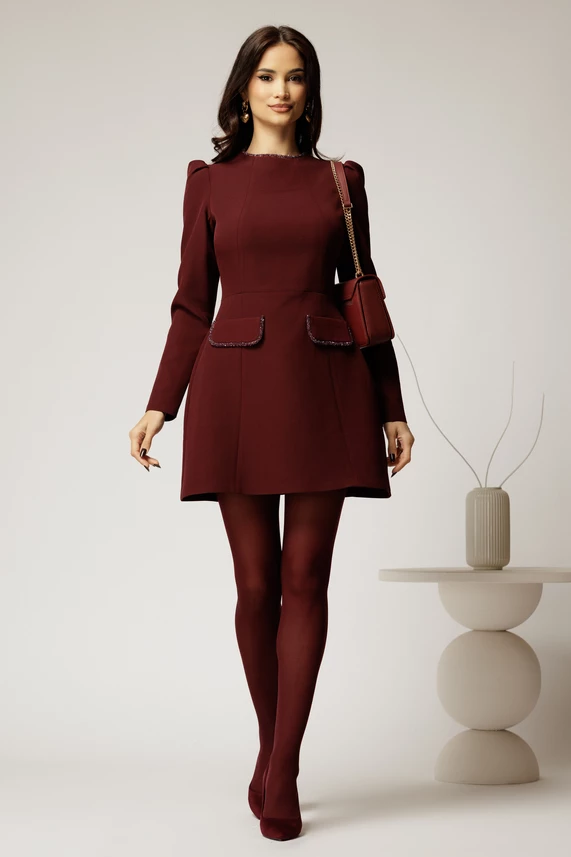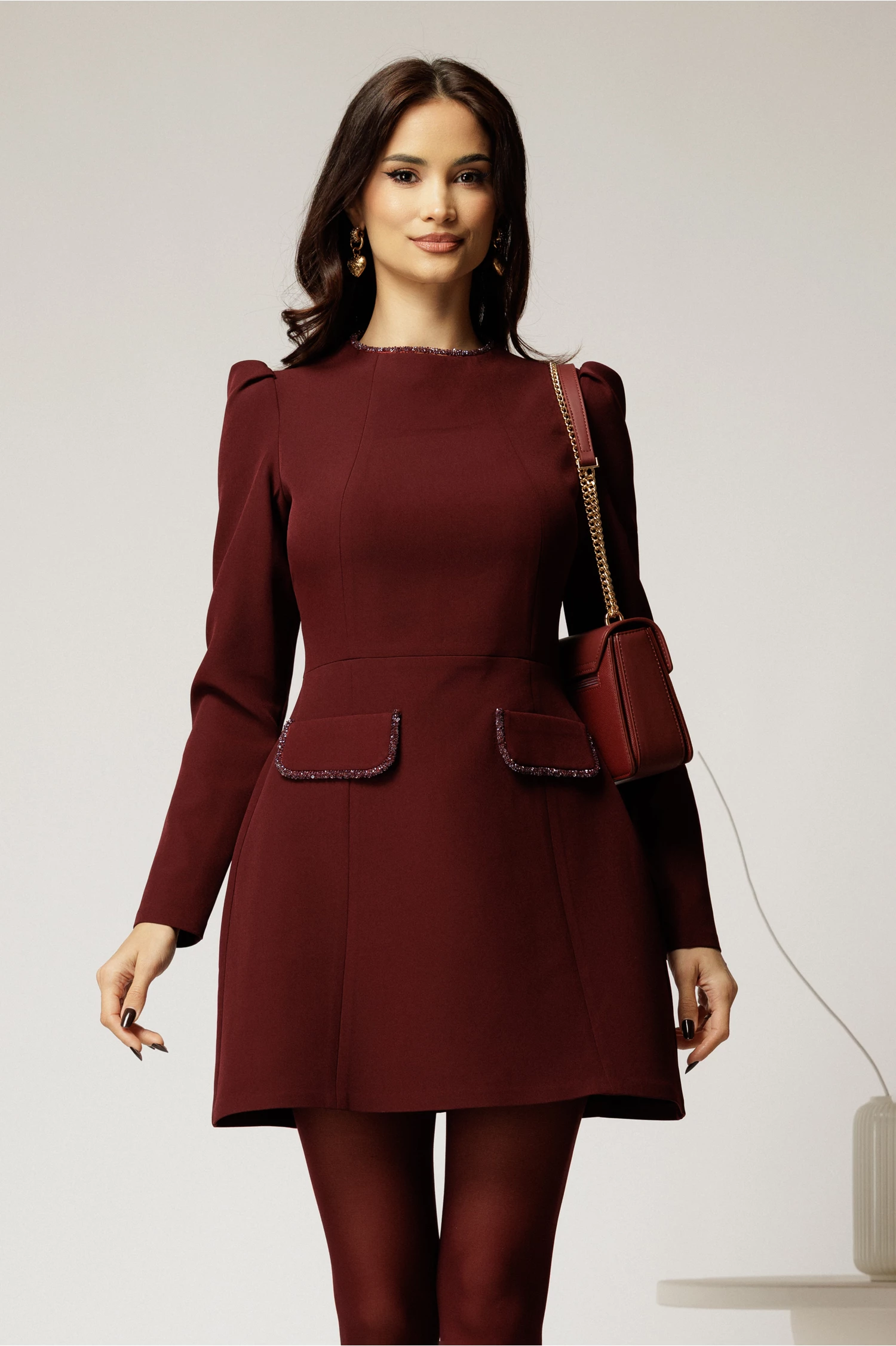 Este o rochie scurta de ocazie de culoare bordo, cu aplicatii la decolteu si buzunare false accesorizate cu pietricele.