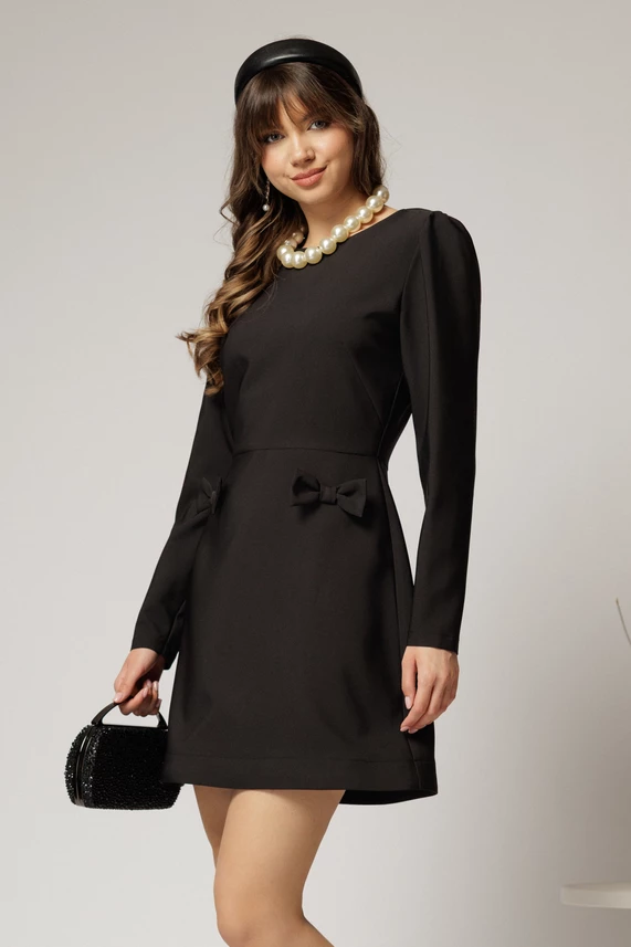 Este o rochie scurta eleganta neagra, cu fusta tip A accesorizata cu fundite. Rochia are decolteul rotund si maneci lungi.