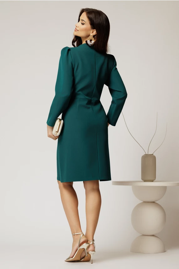 Este o rochie scurta de ocazie de culoare verde, cu aplicatii la decolteu si buzunare false accesorizate cu pietricele.