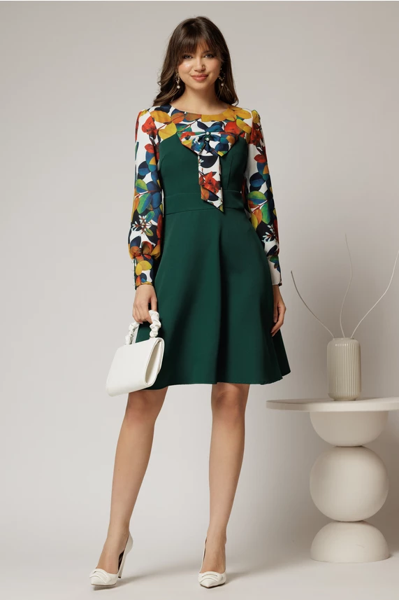 Rochie Andrada din stofa verde cu funda si imprimeu colorat
