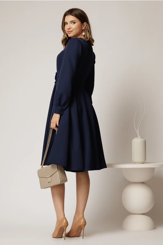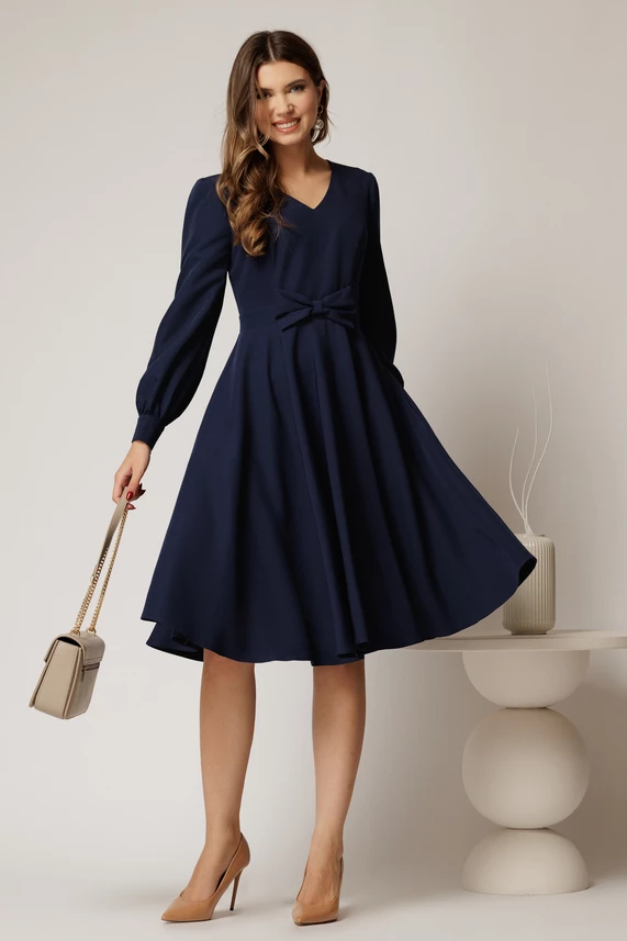 Este o eleganta rochie midi bleumarin, a carei talie este accesorizata cu o funda eleganta. Bustul este pus in evidenta prin decolteul adanc in V, iar manecile bufante ofera un aer de feminitate.