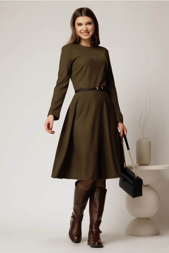 Rochie DY Fashion din tricot kaki cu curea subtire si fusta clos