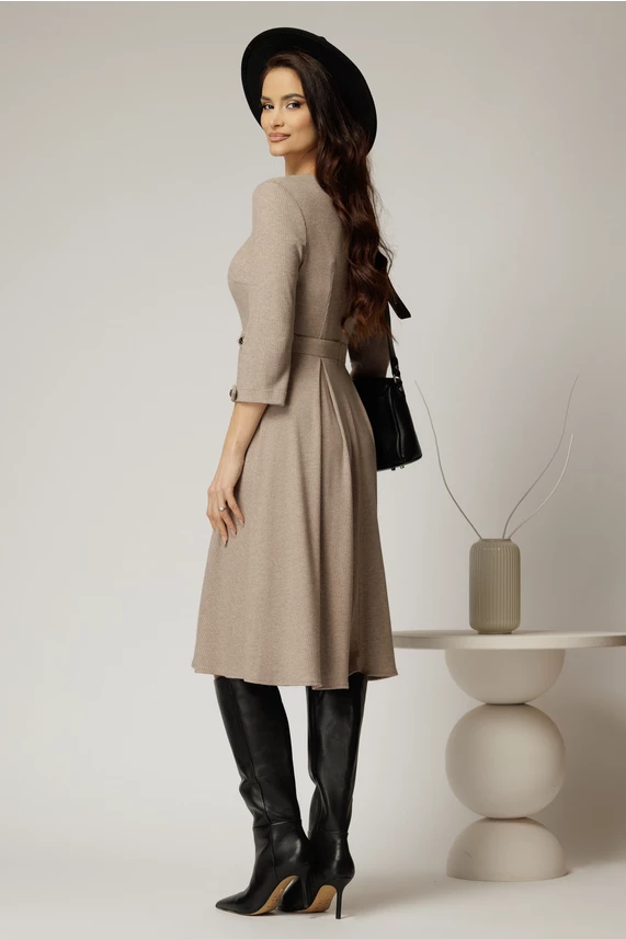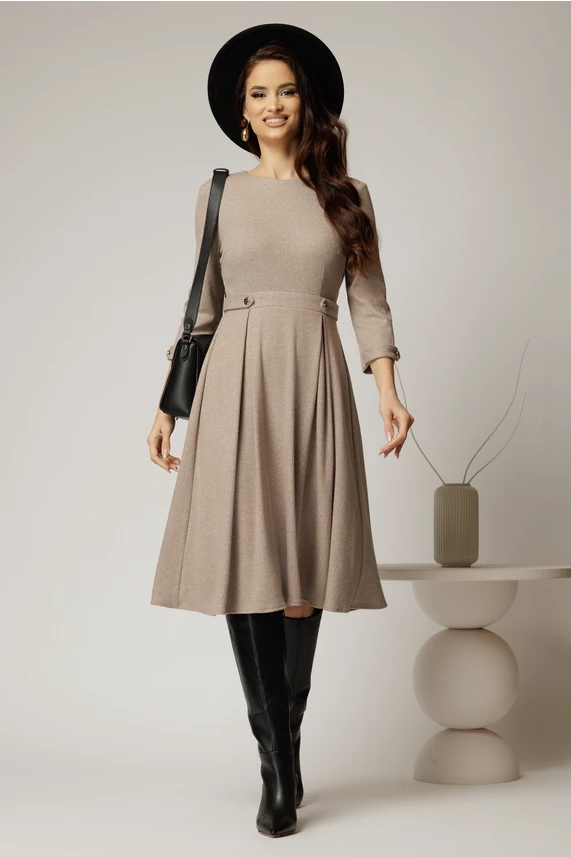 Este o rochie midi bej din tricot cu fusta clos cu pliuri din talie. Rochia are decolteul rotund si talia accesorizata cu nasturi.