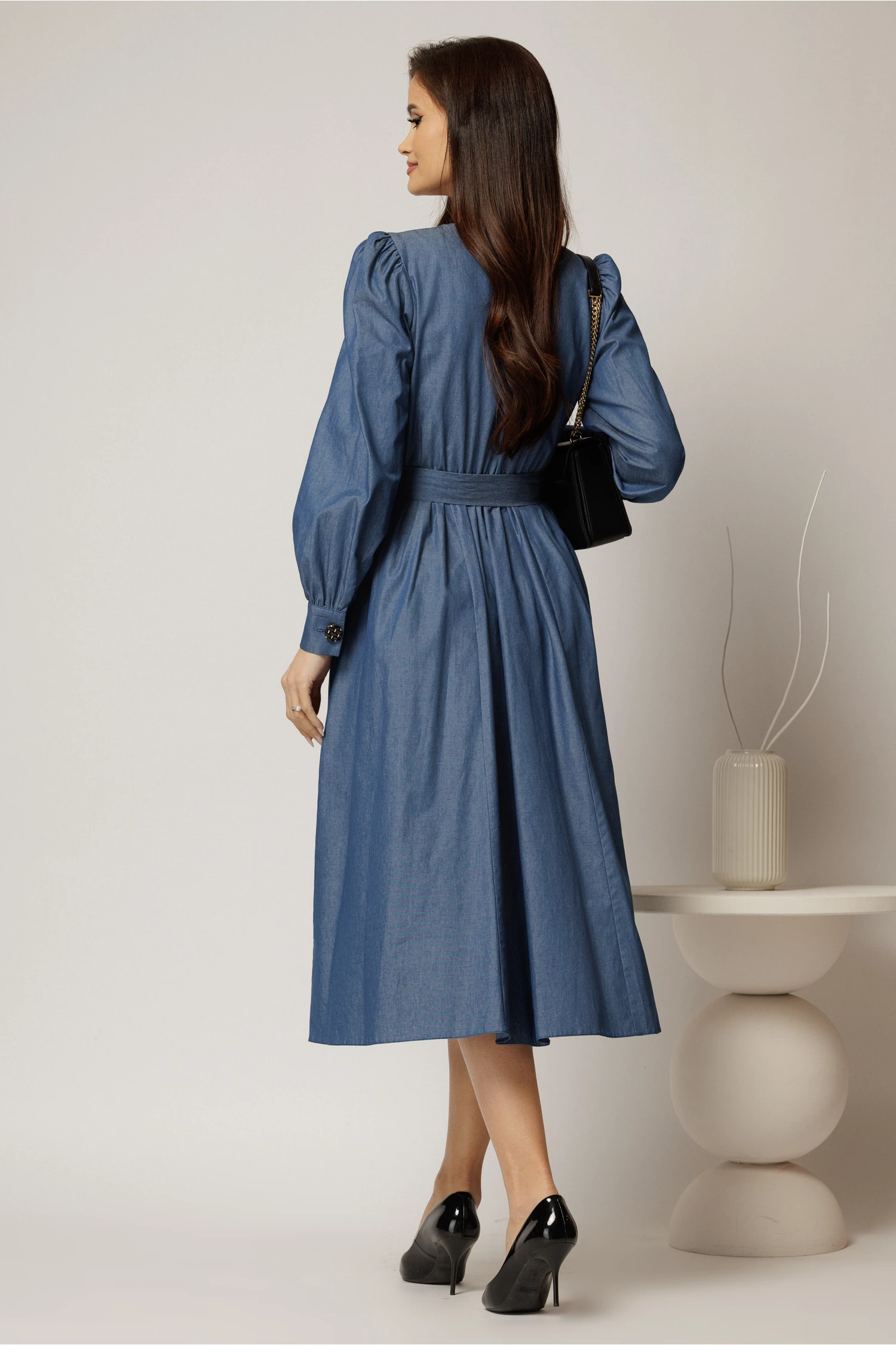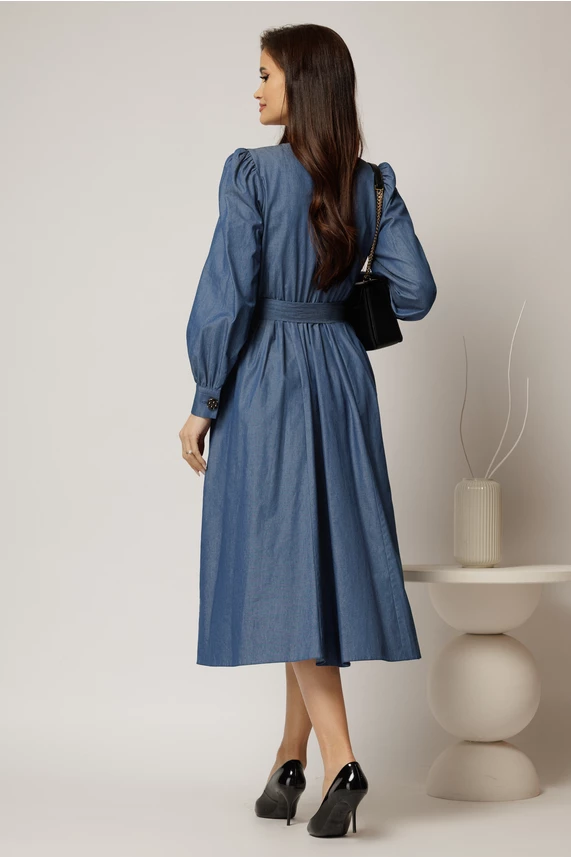 Este o rochie midi bleumarin din bumbac, cu croiul clos si cordon in talie. Rochia are manecile lungi si inchidere cu nasturi pe bust.
