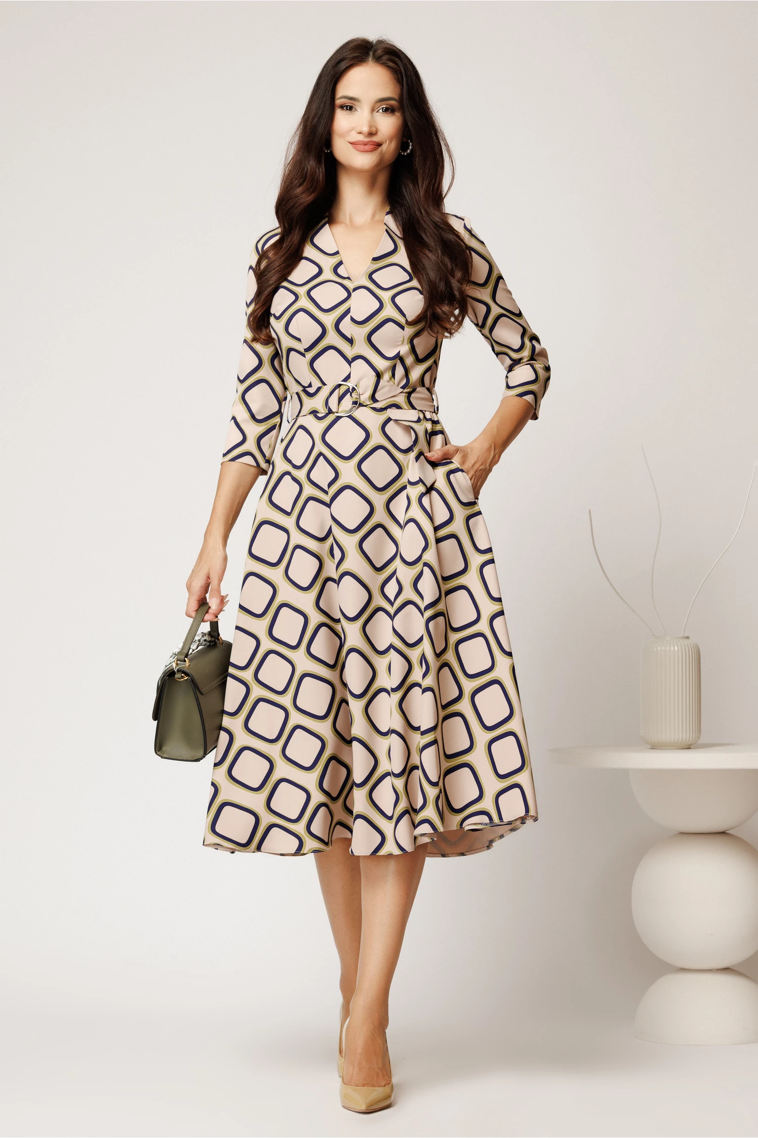 Rochie midi bej din crep cu imprimeu geometric lime si cordon in talie