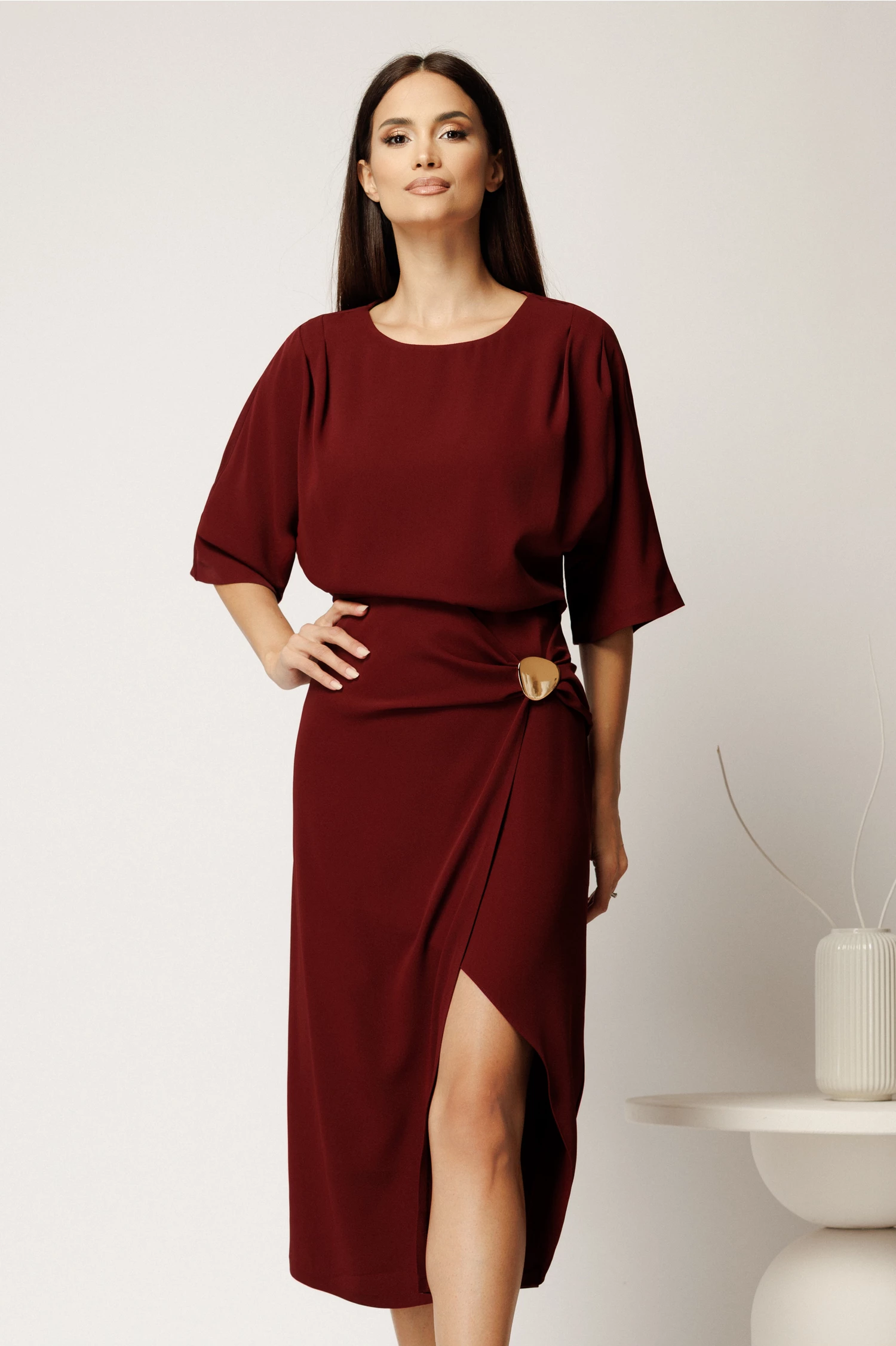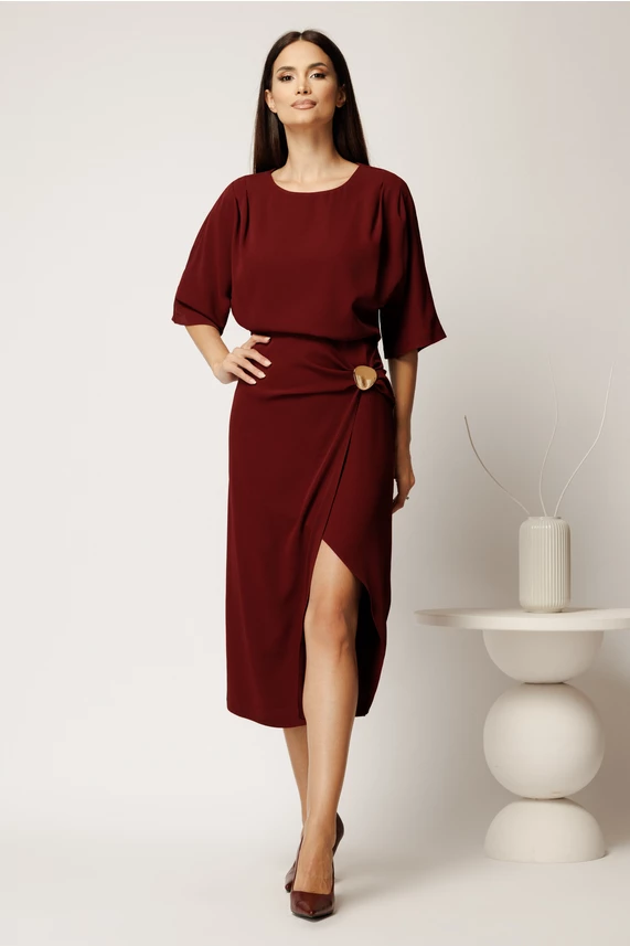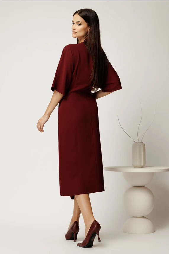 Rochie midi bordo cambrata din triplu voal cu funda si accesoriu pe fusta