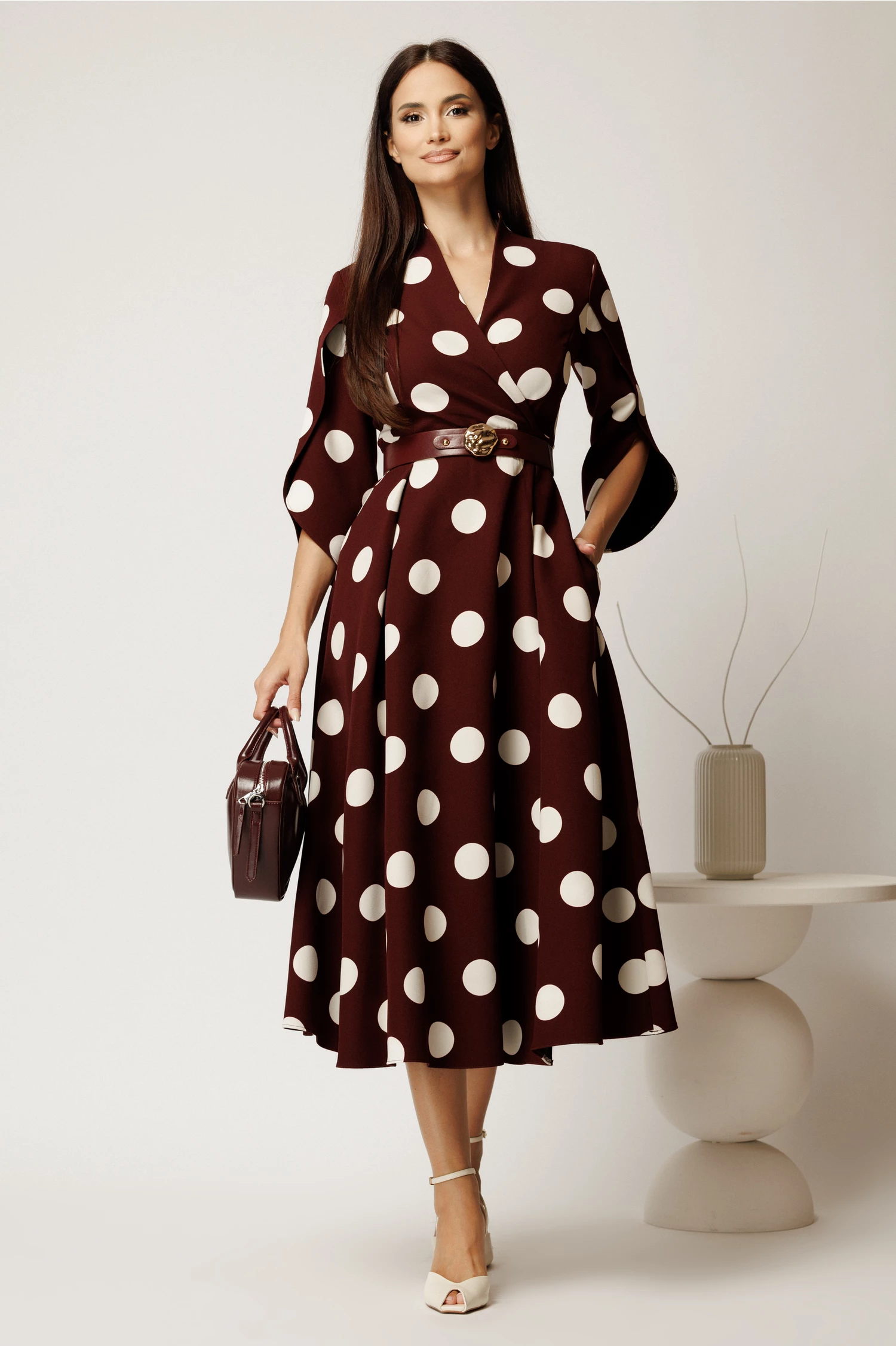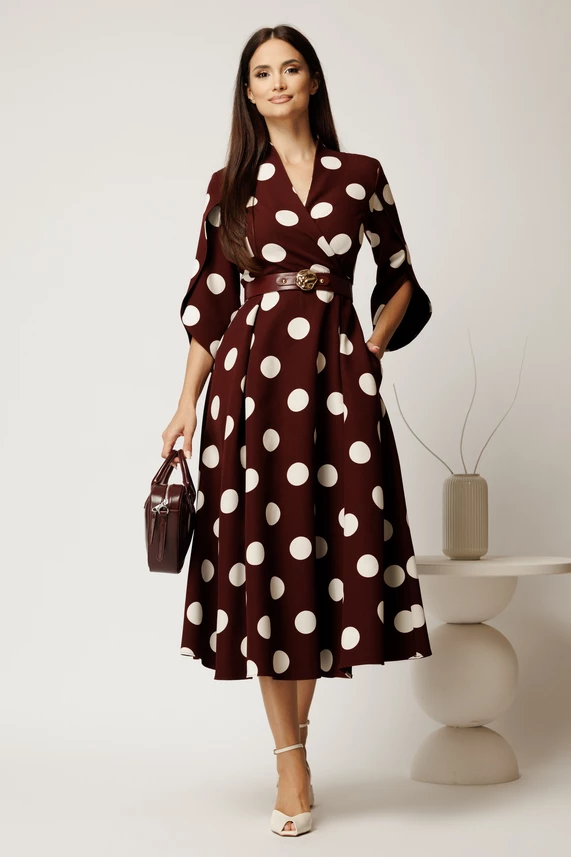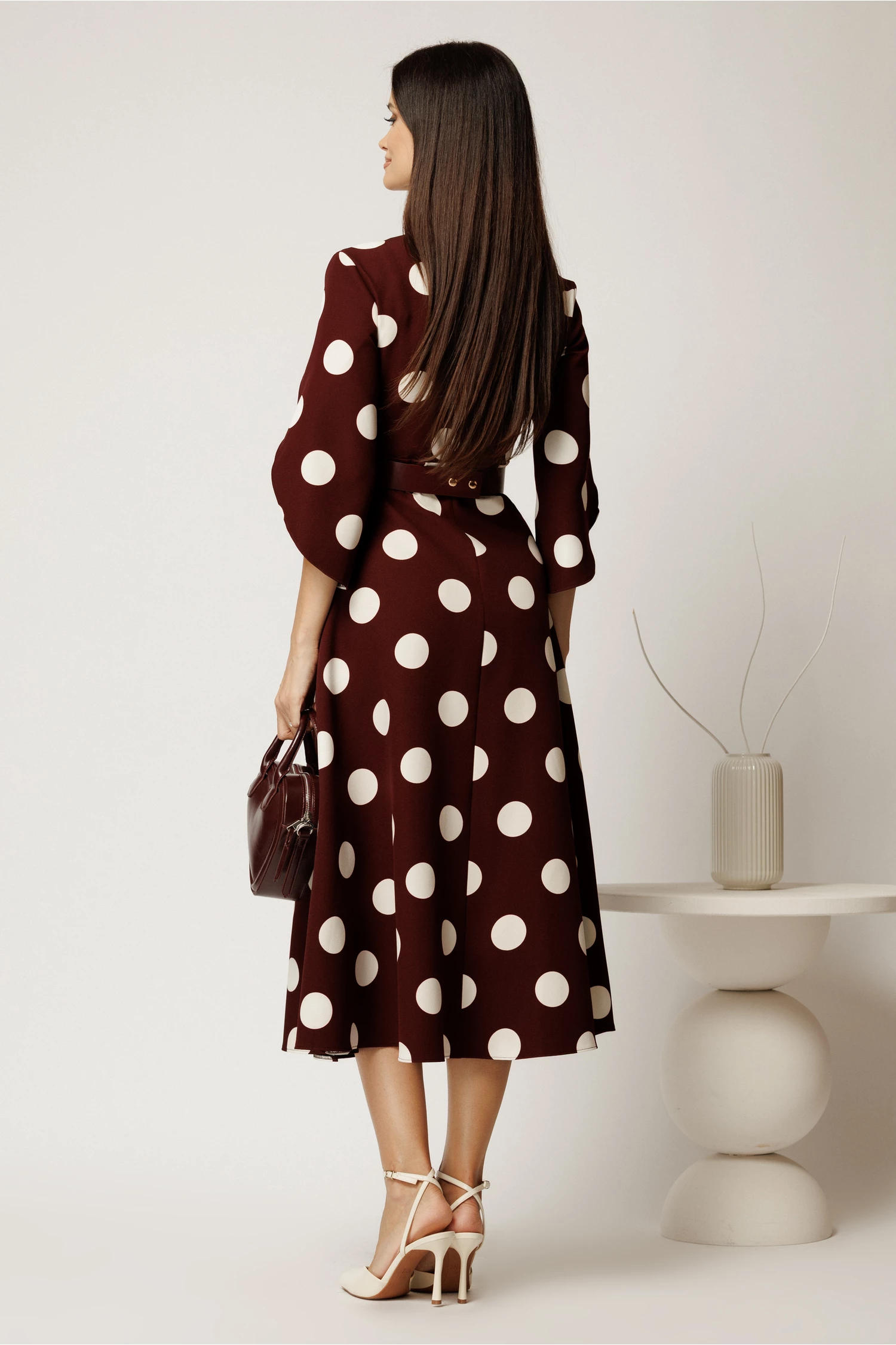 Rochie midi bordo din stofa in clos cu buline mari si curea in talie