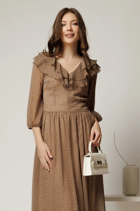 Rochie midi din voal bej cu buline si volanase la decolteu
