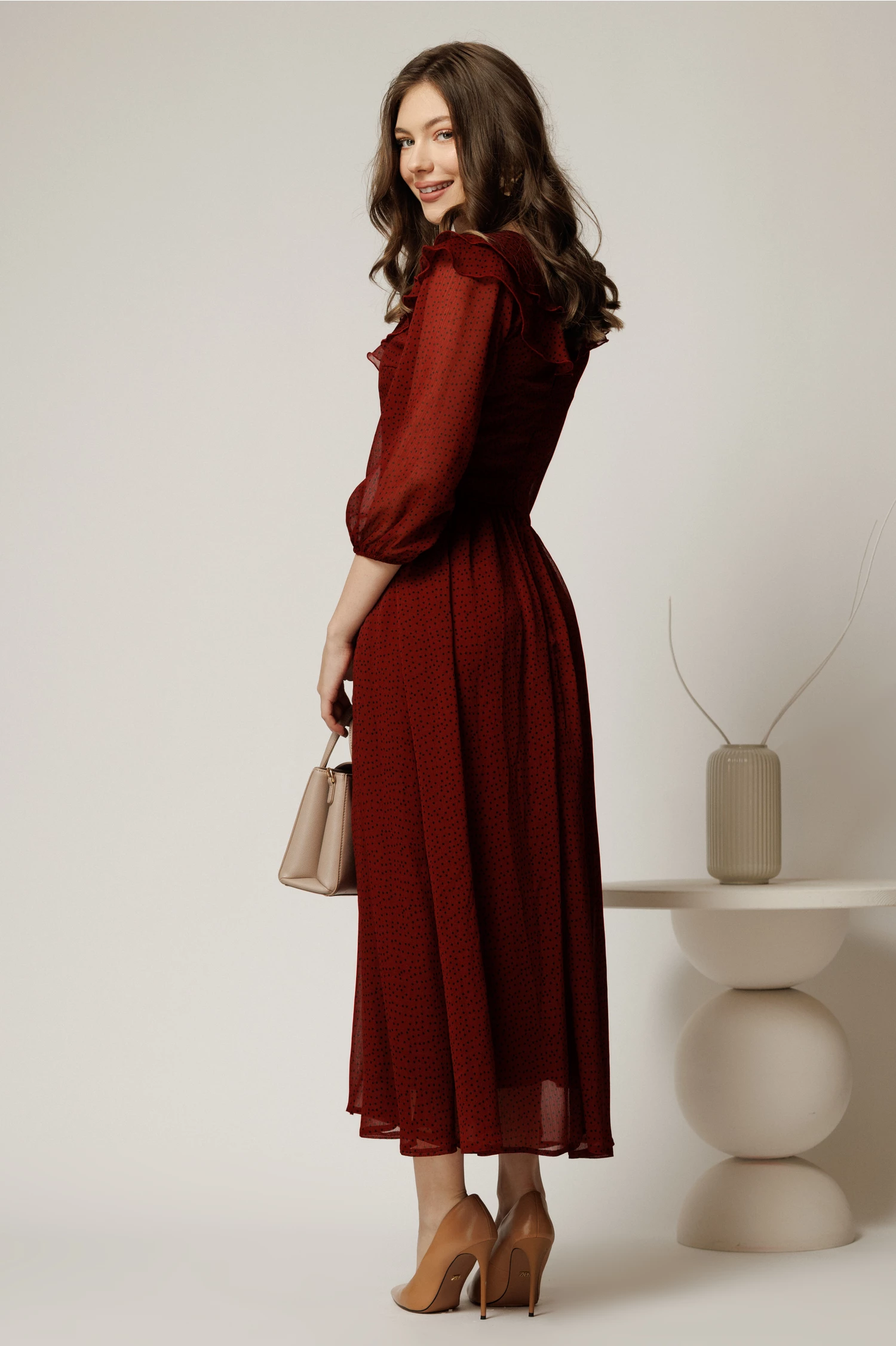 Rochie midi din voal bordo cu buline si volanase la decolteu