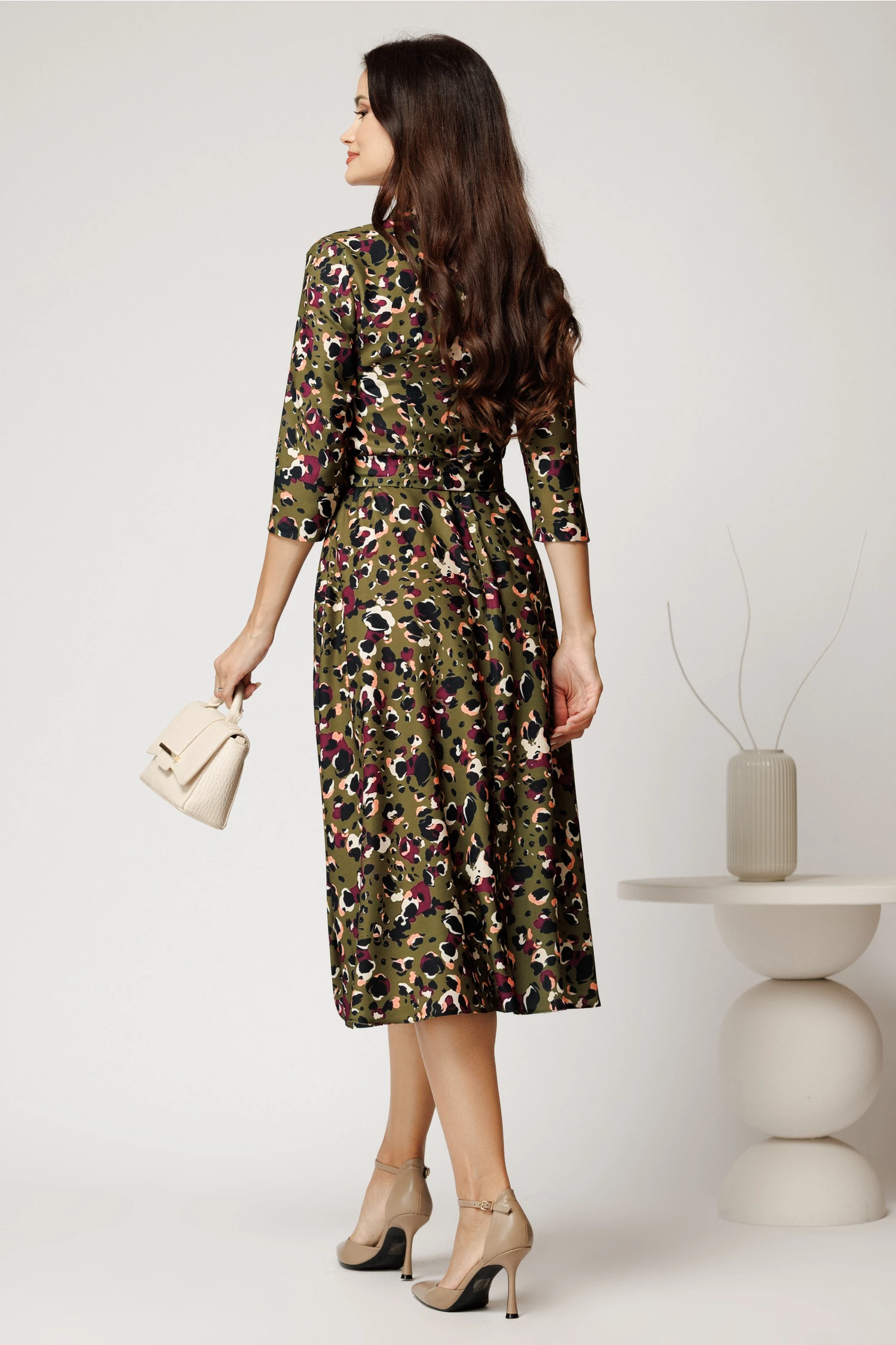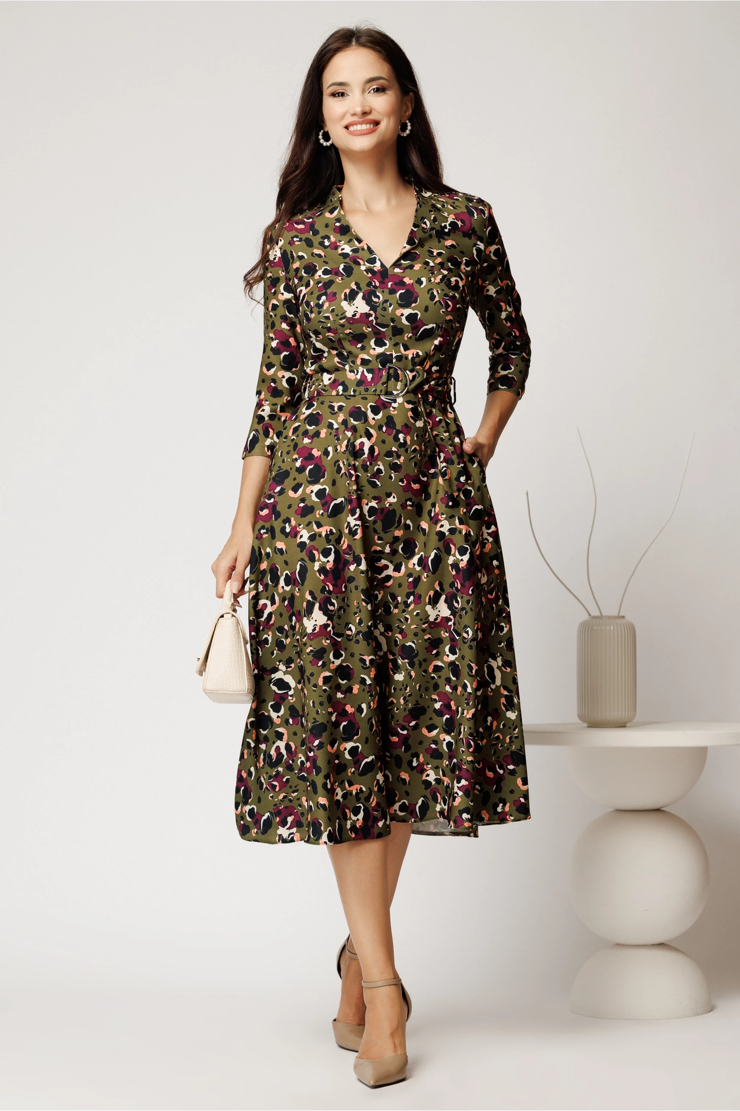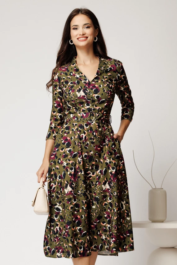 Rochie midi kaki din crep cu imprimeu magenta si cordon in talie