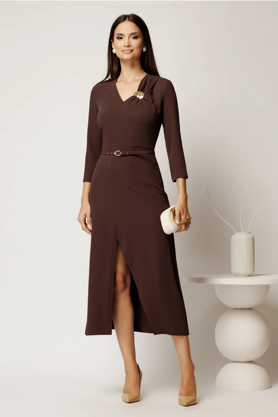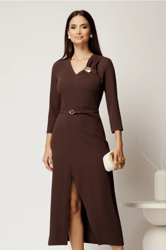 Rochie midi maro din triplu voal cu croi conic si curea in talie