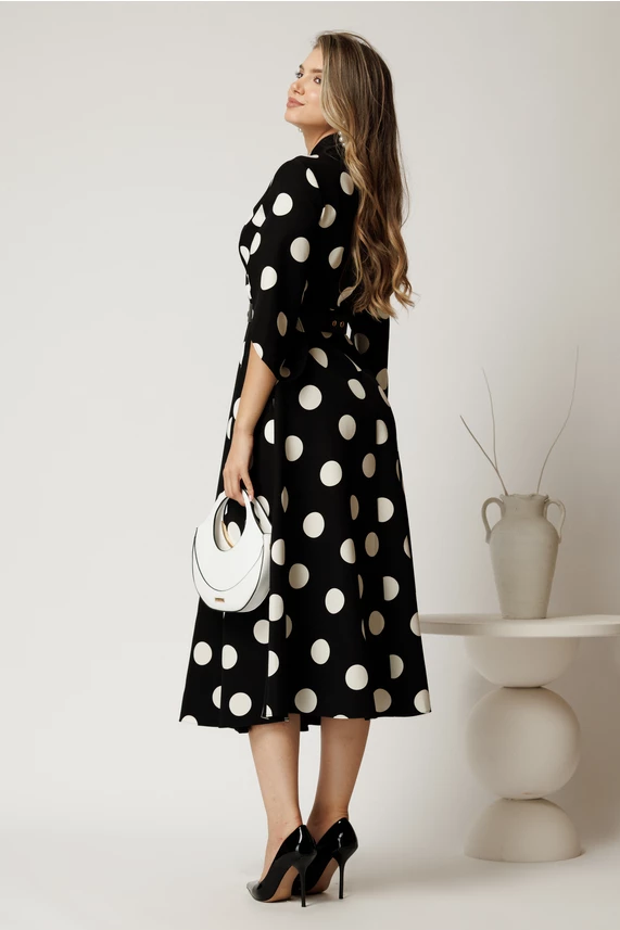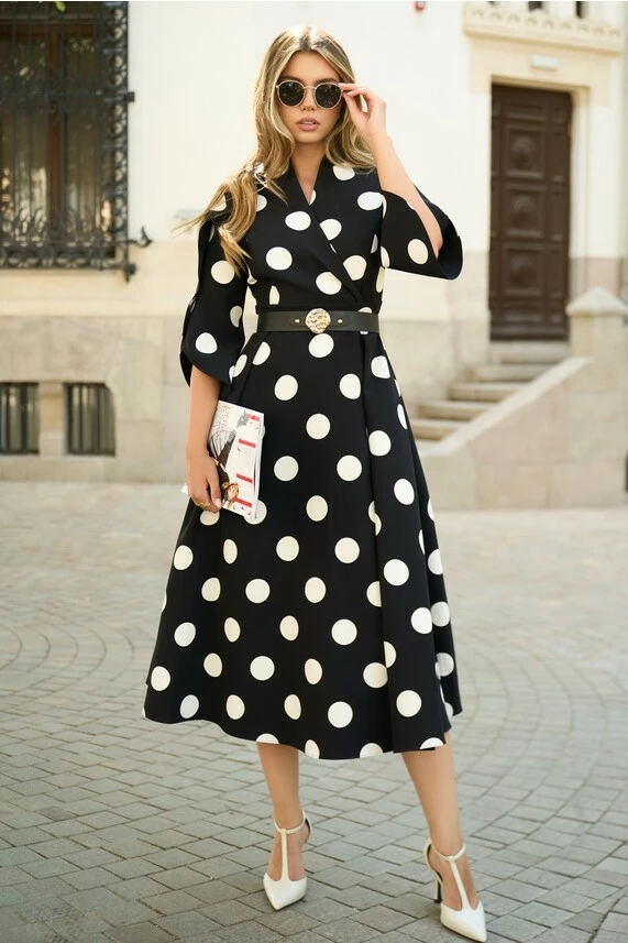 Rochie midi neagra din stofa in clos cu buline mari si curea in talie