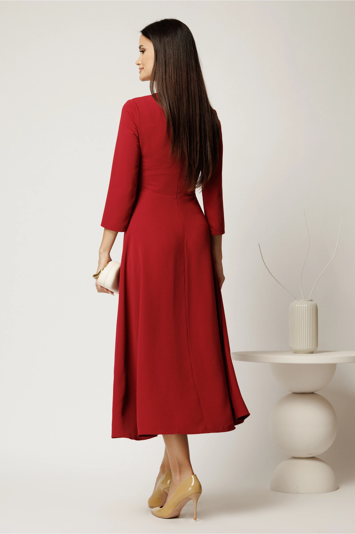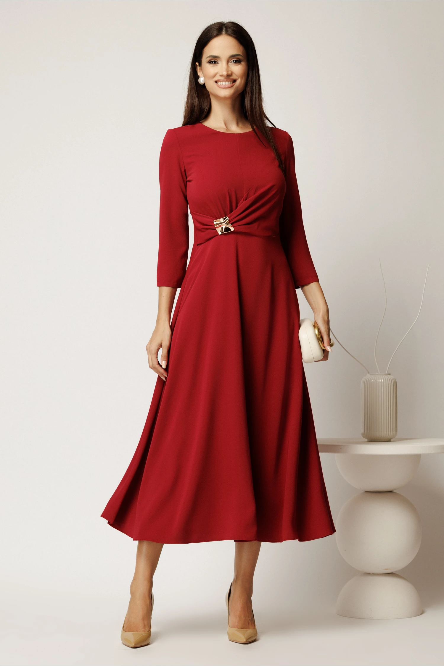 Rochie midi rosie din crep in clos cu fronseu si aplicatie metalica in talie