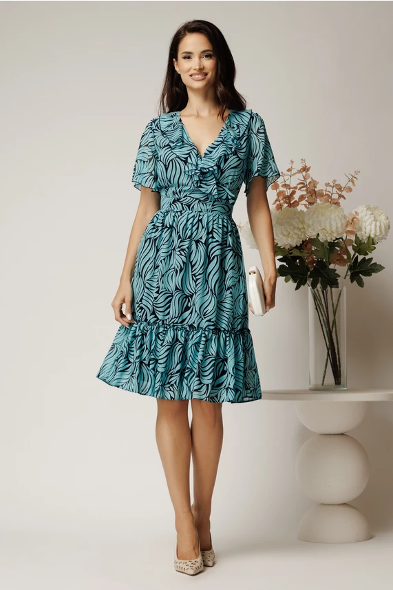 Rochie midi turcoaz din voal cu imprimeu si volane